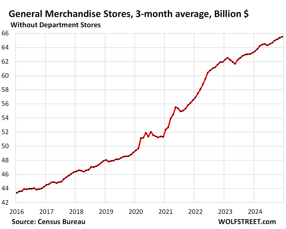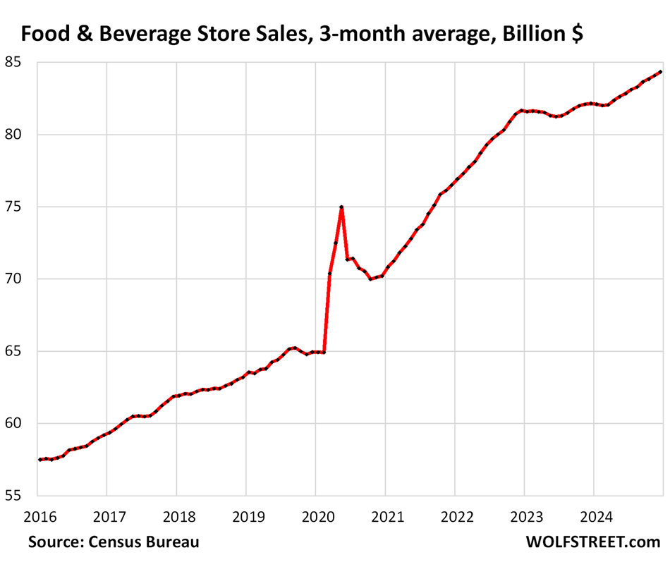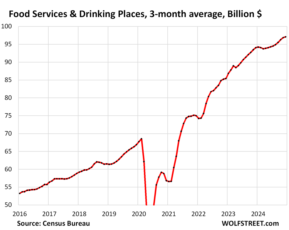 Food services and drinking places (#3 category, 13% of total retail), includes everything from cafeterias to restaurants and bars. After a decline in early 2024, moderate growth resumed: