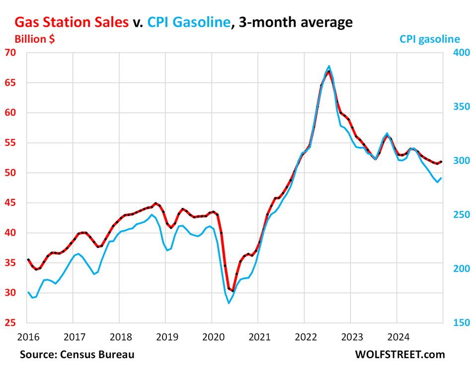 Gas stations (7% of total retail sales). Dollar-sales at gas stations move in near-lockstep with the price of gasoline. The price of gasoline started dropping in mid-2022 and continued to wobble lower until recently. These price declines pushed down dollar-sales at gas stations. Sales at gas stations also include all the other merchandise gas stations sell.