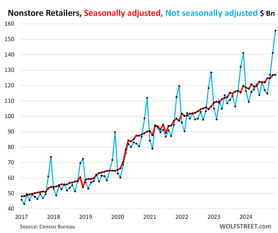 Ecommerce and other “nonstore retailers” (ecommerce retailers, ecommerce operations of brick-and-mortar retailers, and stalls and markets): Total sales not seasonally adjusted jumped by 10.2% year-over-year to $156 billion (blue). Huge seasonal adjustments reduced that to $127 billion (red). The three-month average sales in December from November, seasonally adjusted, jumped by 0.62%: