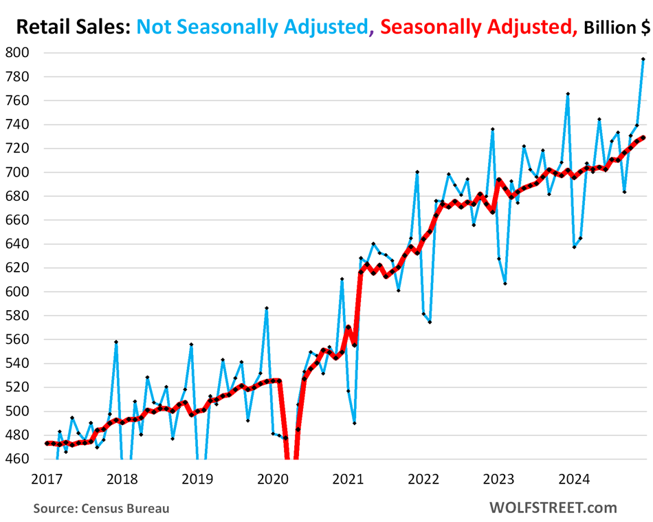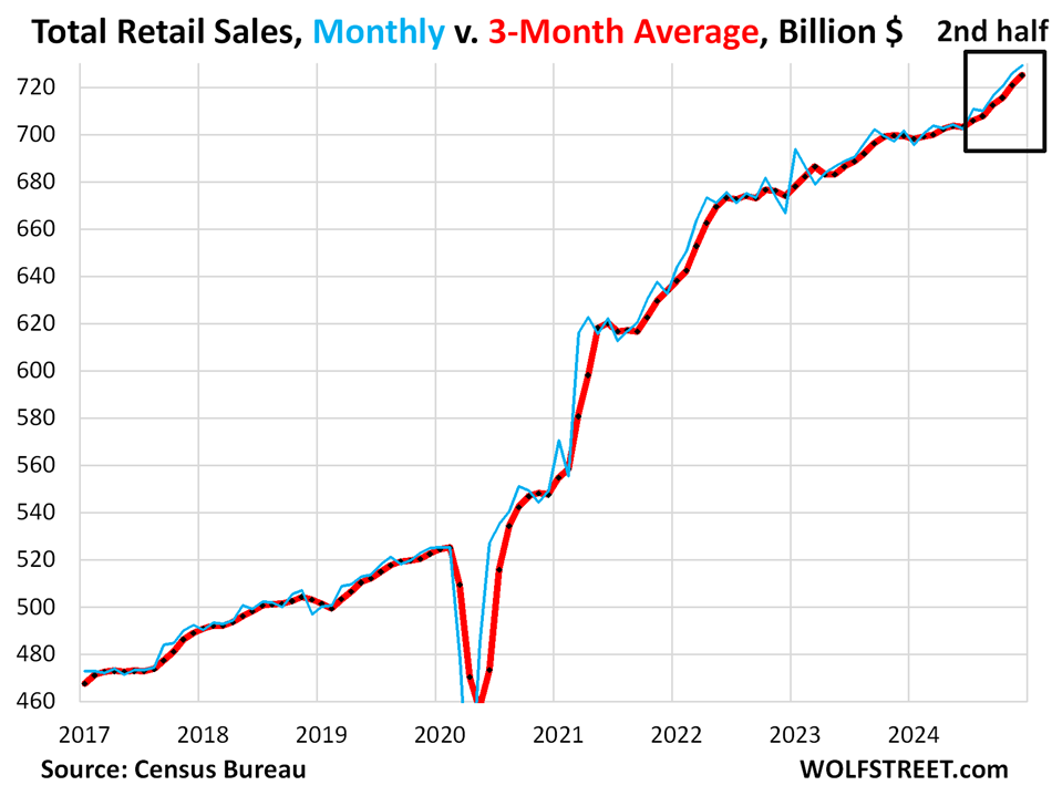 Our Drunken Sailors, as we lovingly and facetiously have come to call them, are in the mood to spend. The labor market has been solid, with an additional 2.23 million payroll jobs created in 2024, and with hourly earnings up by 4%, outpacing inflation for the second year. Consumers are sitting on vast and ballooning piles of cash in money-market funds and CDs. Stocks, home prices, and cryptos have soared in recent years, and consumers that hold them (64% are homeowners and many hold stocks in their retirement funds) are feeling flush.