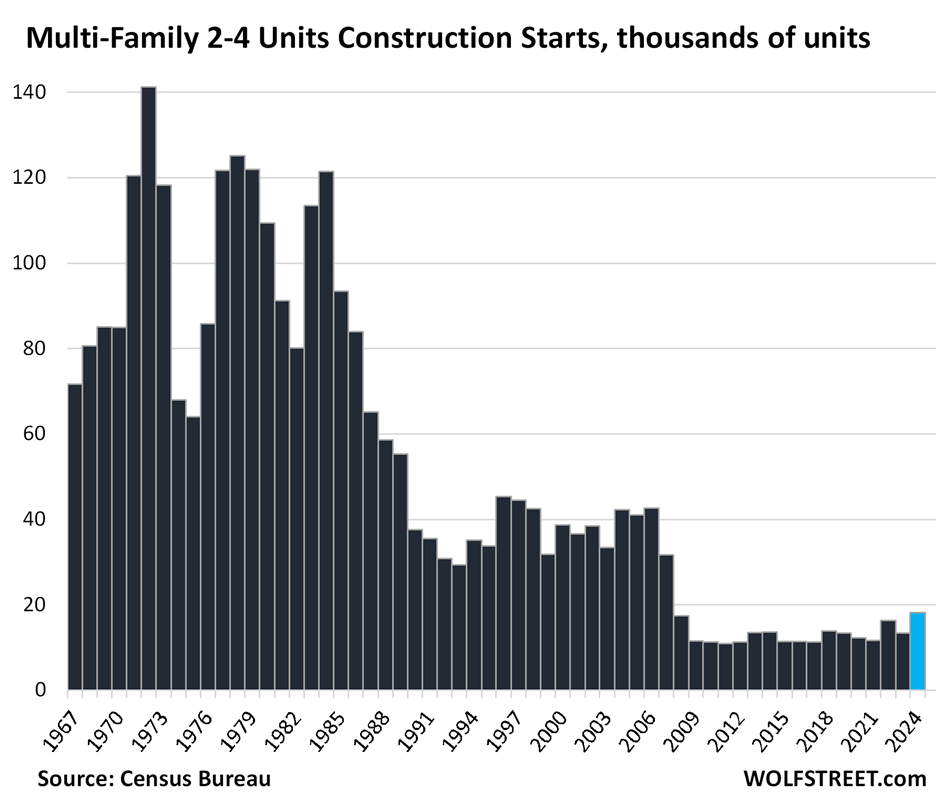 Small multifamily buildings, despite the plunge in overall multifamily starts, saw sort of a revival. Starts in buildings with 2-5 units rose by 36% in 2024 to 18,200 units, the highest since 2007.