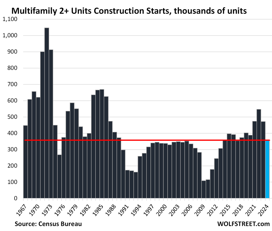But multifamily construction starts plunged by 25% in 2024 from 2023, to 354,800 housing units, and are down by 35% from the boom year 2022, amid the large-scale oversupply that has been piling up in many markets for a few years, and amid the general depression in Commercial Real Estate, the long series of big CRE debt defaults, the losses investors and lenders have taken, the difficulty in getting new financing to start a multifamily project, and the impossibility in many cases to make those interest rates work with the expected rents.