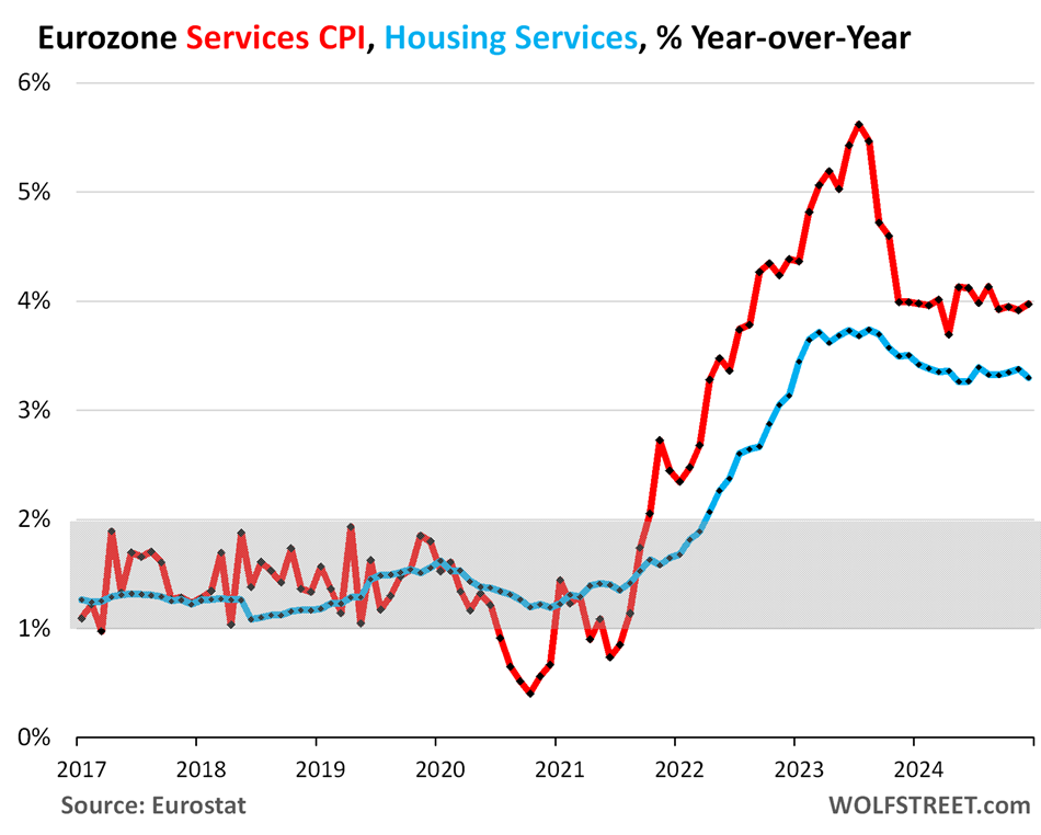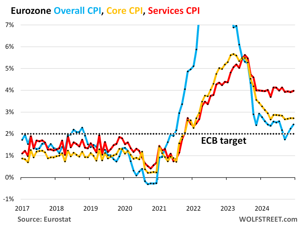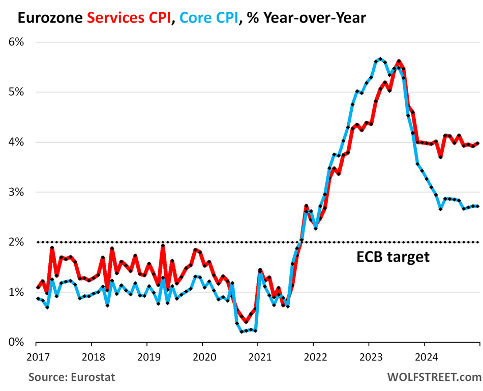 Worries about services inflation have for months cropped up the ECB’s announcement about its policy rates, which it has cut four times so far. This stubbornly high services inflation “reflects strong wage pressures and the fact that some services prices are still adjusting with a delay to the past inflation surge,” it said at its December 12 policy statement, when it nevertheless cut its deposit rate by another 25 basis points to 3.0%.