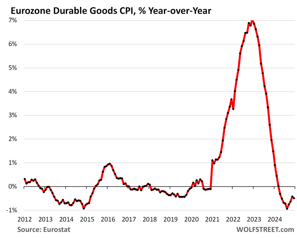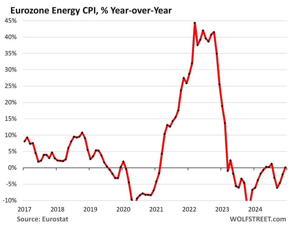 What had caused overall CPI for the Eurozone to cool substantially between mid-2022 and October 2024, were the plunge in energy prices off the huge spike, the drop in durable goods prices that had surged during the pandemic, and relative stability in food prices at very high levels. But now that honeymoon of cooling overall inflation is over.