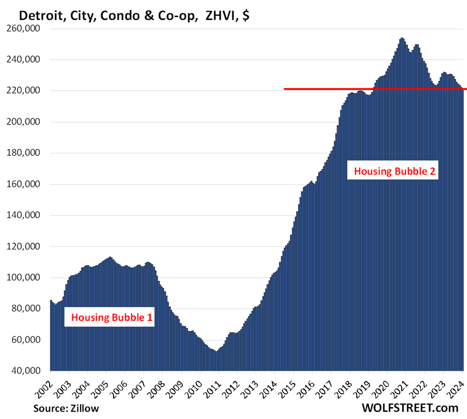 These prices here are seasonally adjusted and a three-month moving average to iron out the month-to-month squiggles. They’re part of the Zillow Home Value Index (ZHVI) data, based on the Zillow Database of All Homes. These are not median prices.