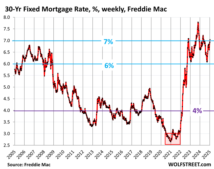 The “locked-in effect” has bedeviled the US housing market ever since mortgage rates went back to the old-normal levels in the era before QE, before 2009. This effect describes a feeling of homeowners with mortgage rates that are well below the current rates, such as 30-year fixed-rate mortgages with rates below 4% and even below 3%. These homeowners obviously rejoice in the deal they got, and many swear up and down that they will never ever give it up.