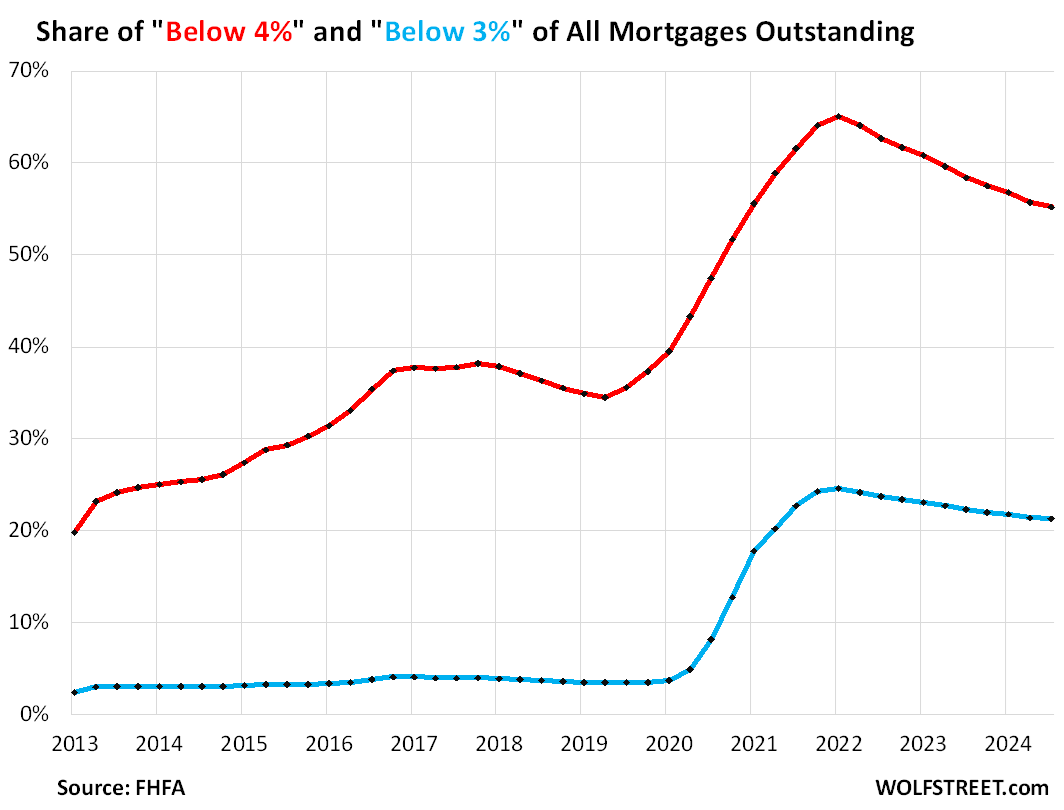 The share of mortgages with rates below 4% has dropped to 55.2% of all mortgages outstanding at the end of Q3 2024, from the high of 65.1% in Q1 2022 (red). This is the share of the total number of mortgages outstanding, not of mortgage balances.