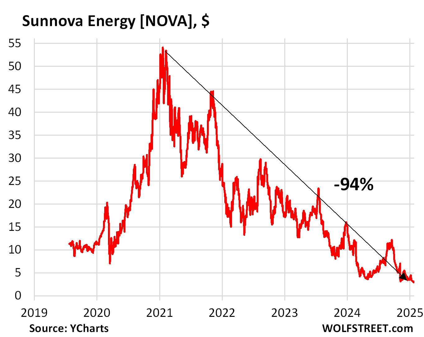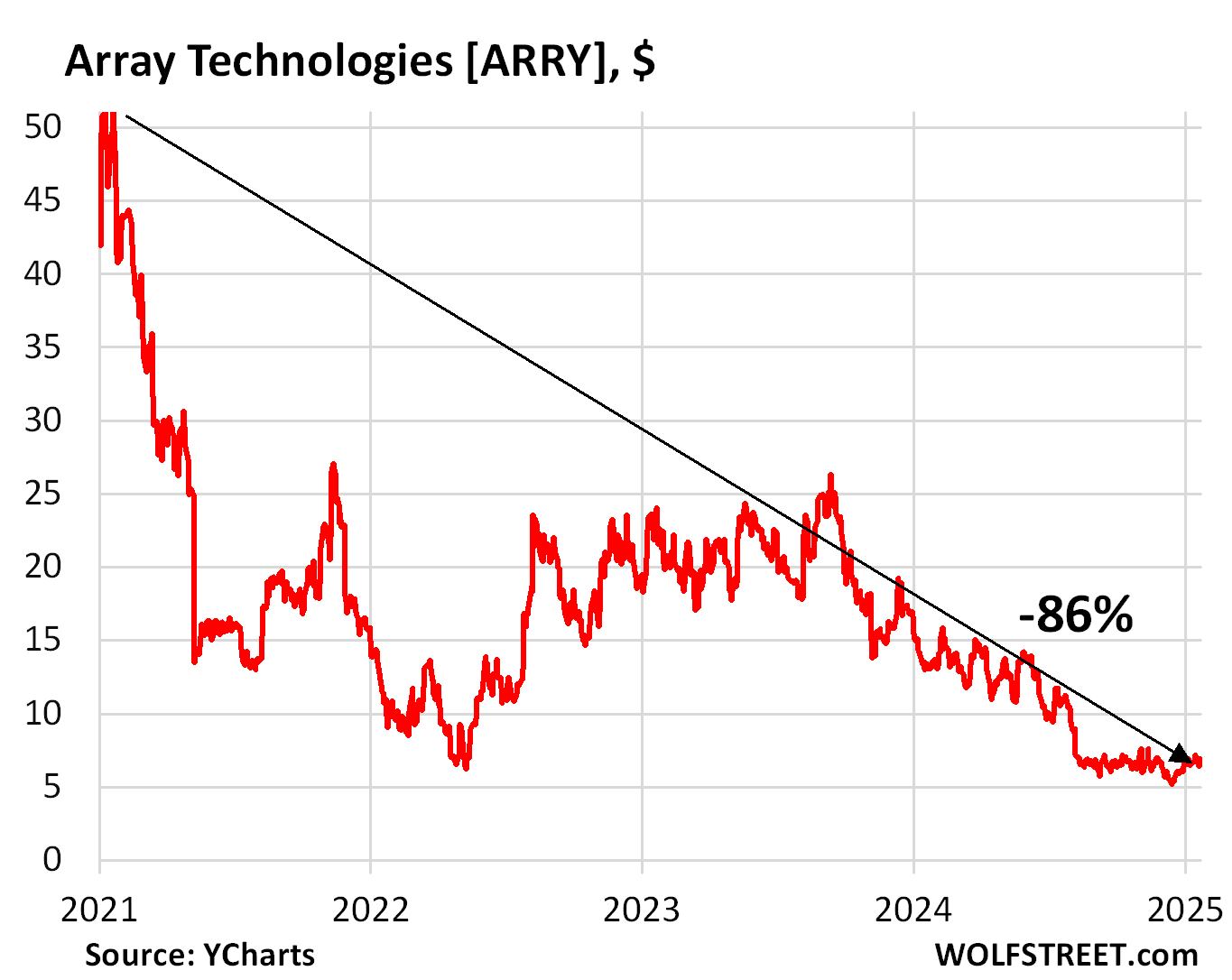 Shoals Technologies [SHLS], which makes assorted equipment for solar systems, including utility-scale systems, went public via IPO in January 2021 at $25 a share. A month later, it was at $40.17, which was also the peak. Since then, shares have plunged 89% to $4.67 today.