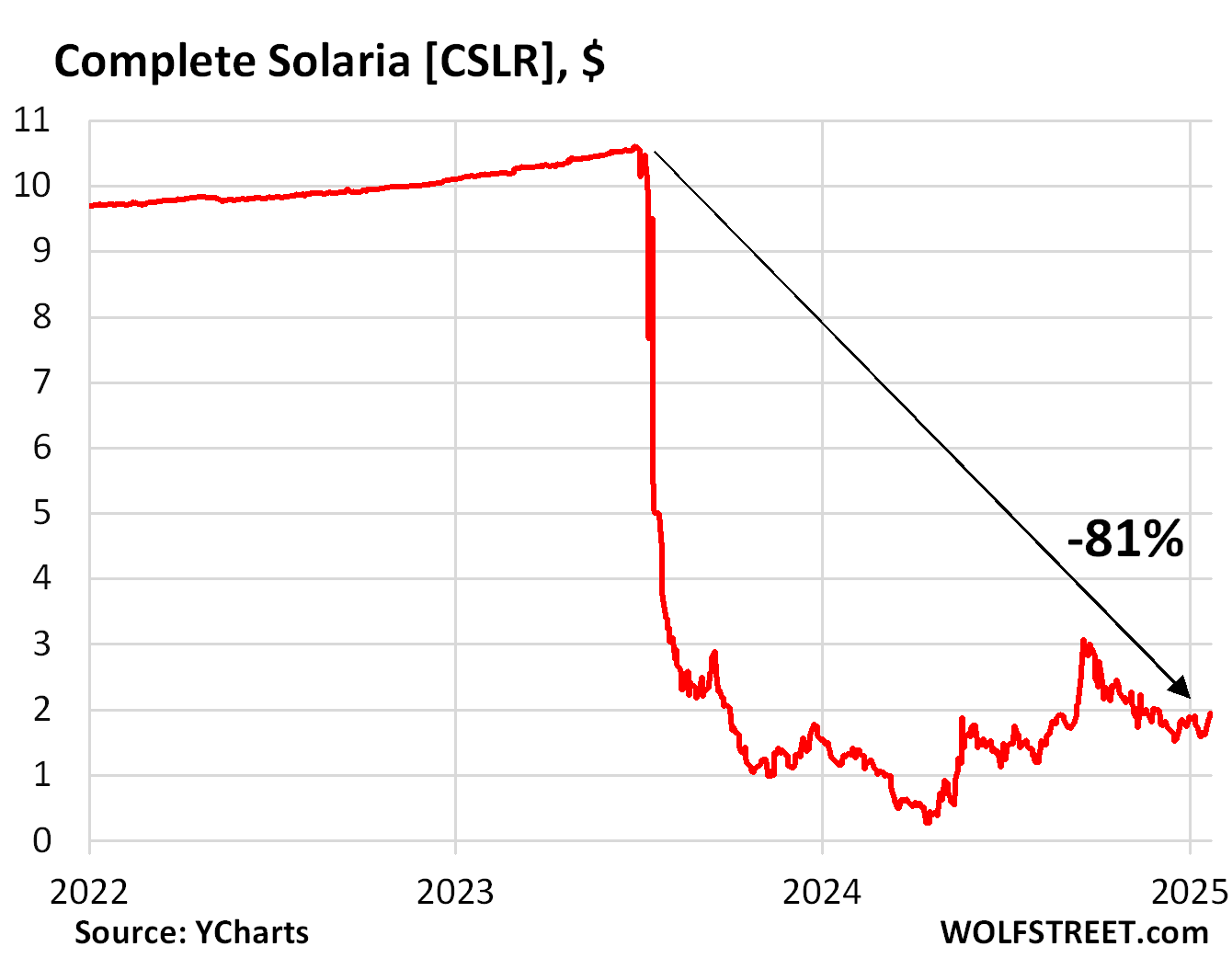 Complete Solaria [CSLR], the residential solar systems provider that acquired SunPower’s assets for $45 million, had gone public via merger with a SPAC in July 2023, an amazing feat, given that the ignominious SPAC bubble had already collapsed. From the merger-share price of $10 a share, the stock has plunged by 81% to about $1.90 currently, including a slick rug-pull right after the SPAC merger was completed (data via YCharts).