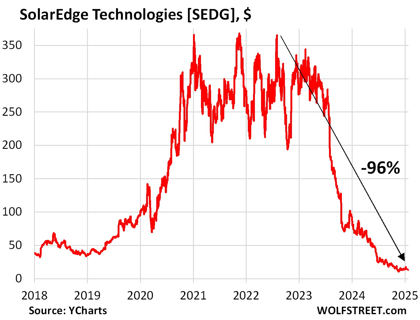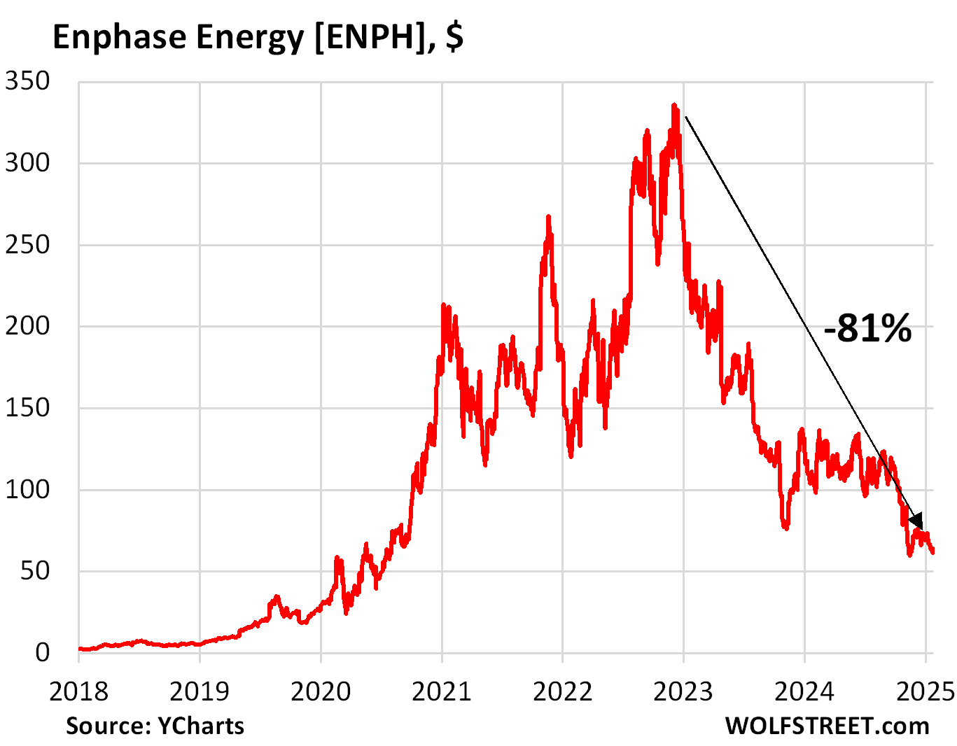 Enphase Energy [ENPH], makes equipment for residential and business solar and storage systems, and EV chargers. After the California-based company had gone public via IPO in 2012, its stock wobbled along the single-digit-dollar line for years. But then in 2019, it took off and multiplied by 48, to $336.00 in December 2022, before collapsing. Today, it’s down by 81% from that high.