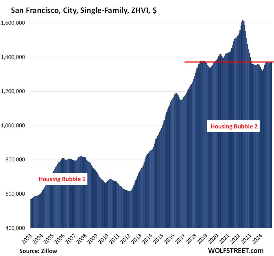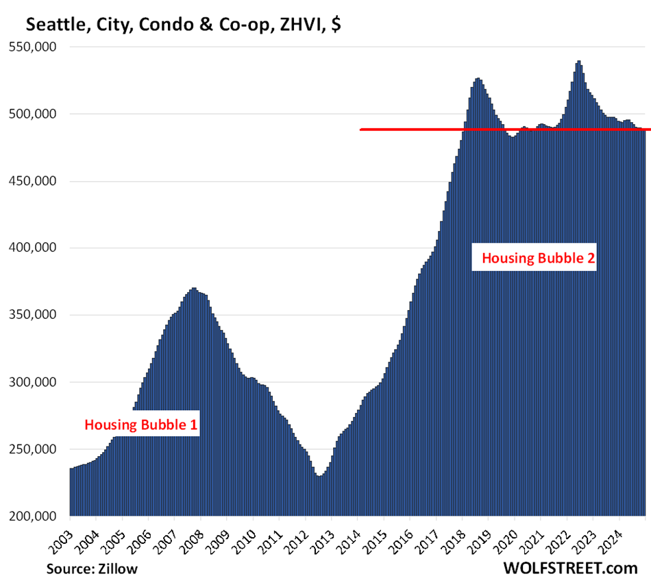 Here are all our charts and data of the big cities with the biggest price declines from their respective peaks years ago. And here are our charts and figures of home prices in the 33 biggest metropolitan areas, from steep declines to ongoing increases, documenting the divergence in the US housing market.
