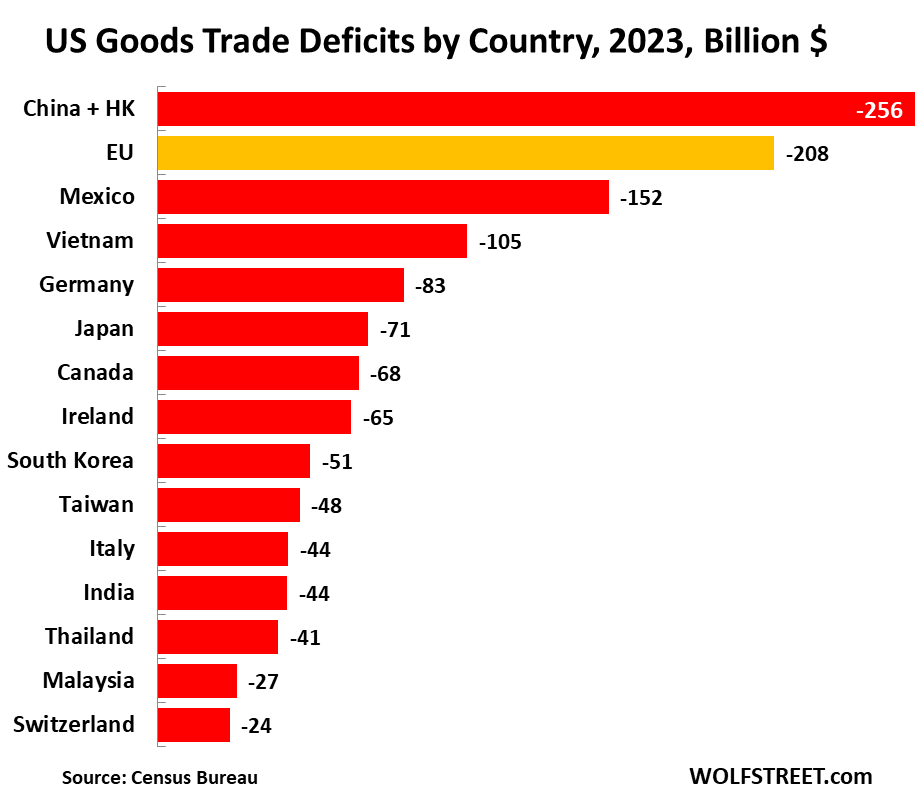 1. The US had the biggest trade deficits in 2023 with China, then Europe, then Mexico — TRADE DEFICITS. In 2018, the trade deficit with China was even bigger. Imports from China got slammed by tariffs, so some of the trade was then routed through Vietnam by 2023 as you can see in the chart below.