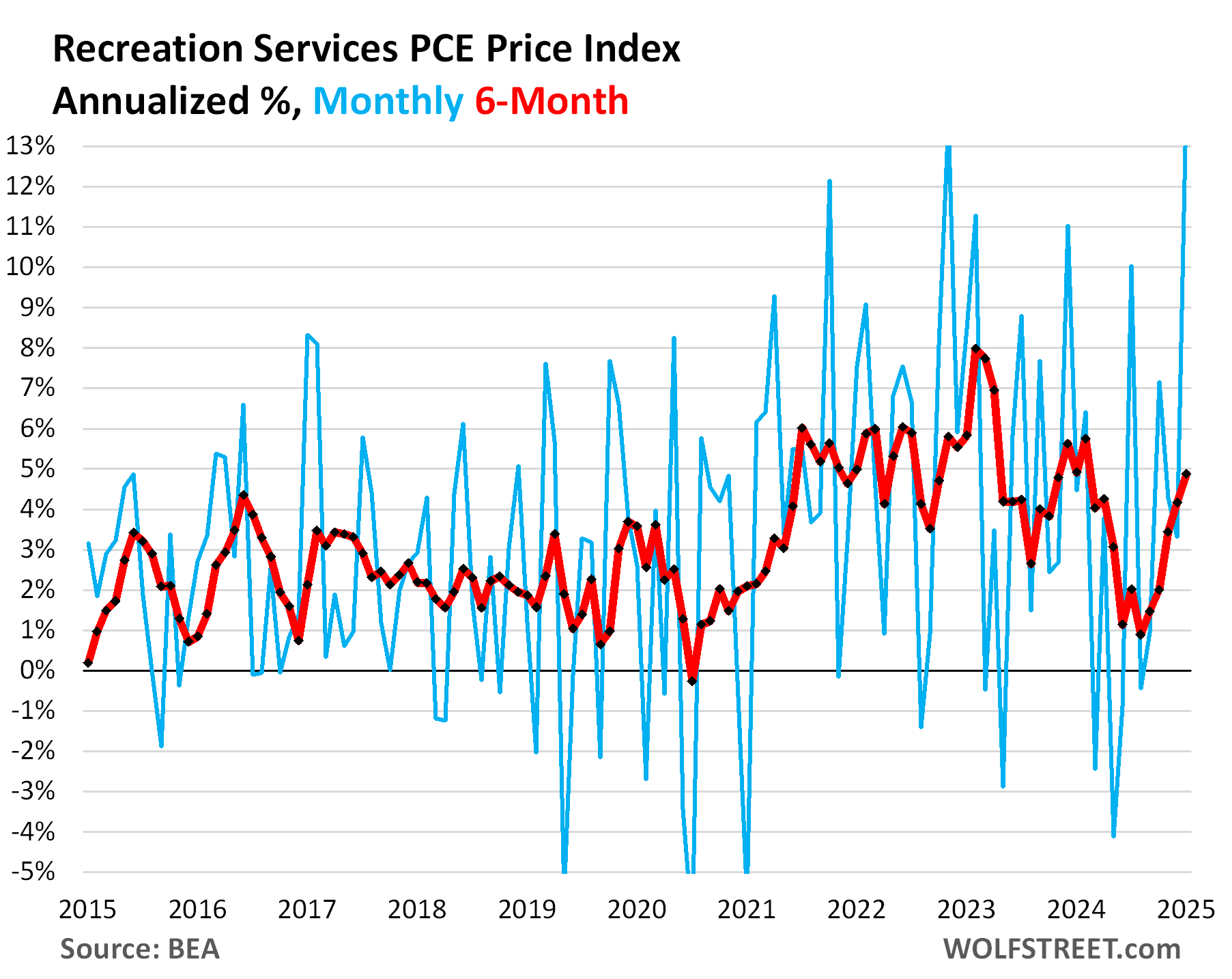 Here are recreation services. The chart goes from -5% to +13%, and it still cuts off some of the bottoms and tops of the month-to-month swings (blue). The six-month average is more meaningful (red):