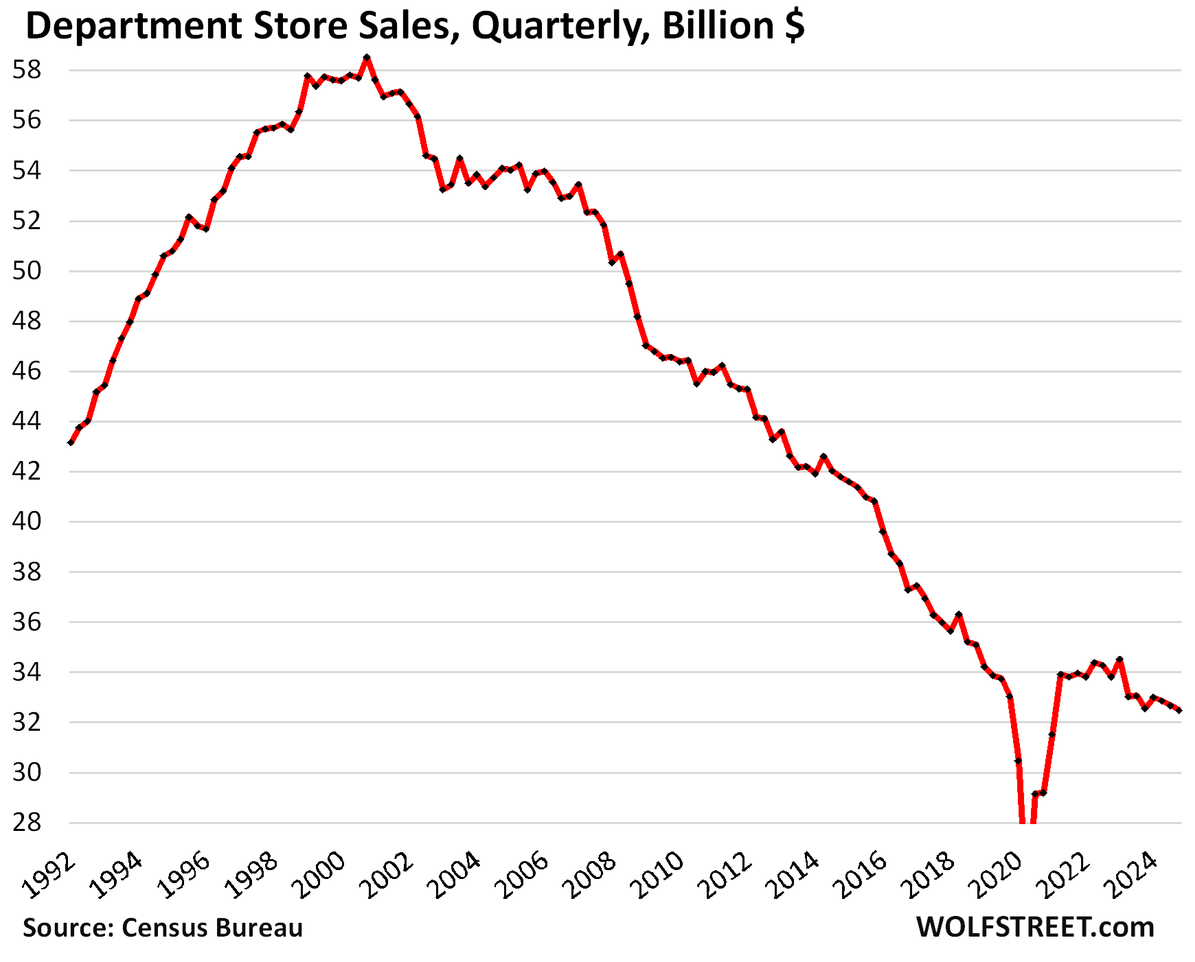 Since the peak in 2000, over those 24 years, department store sales have collapsed by 43%. There is no recovery for brick-and-mortar department stores. As Americans changed how they shop, the business model of brick-and-mortar department stores collapsed under the weight of ecommerce.