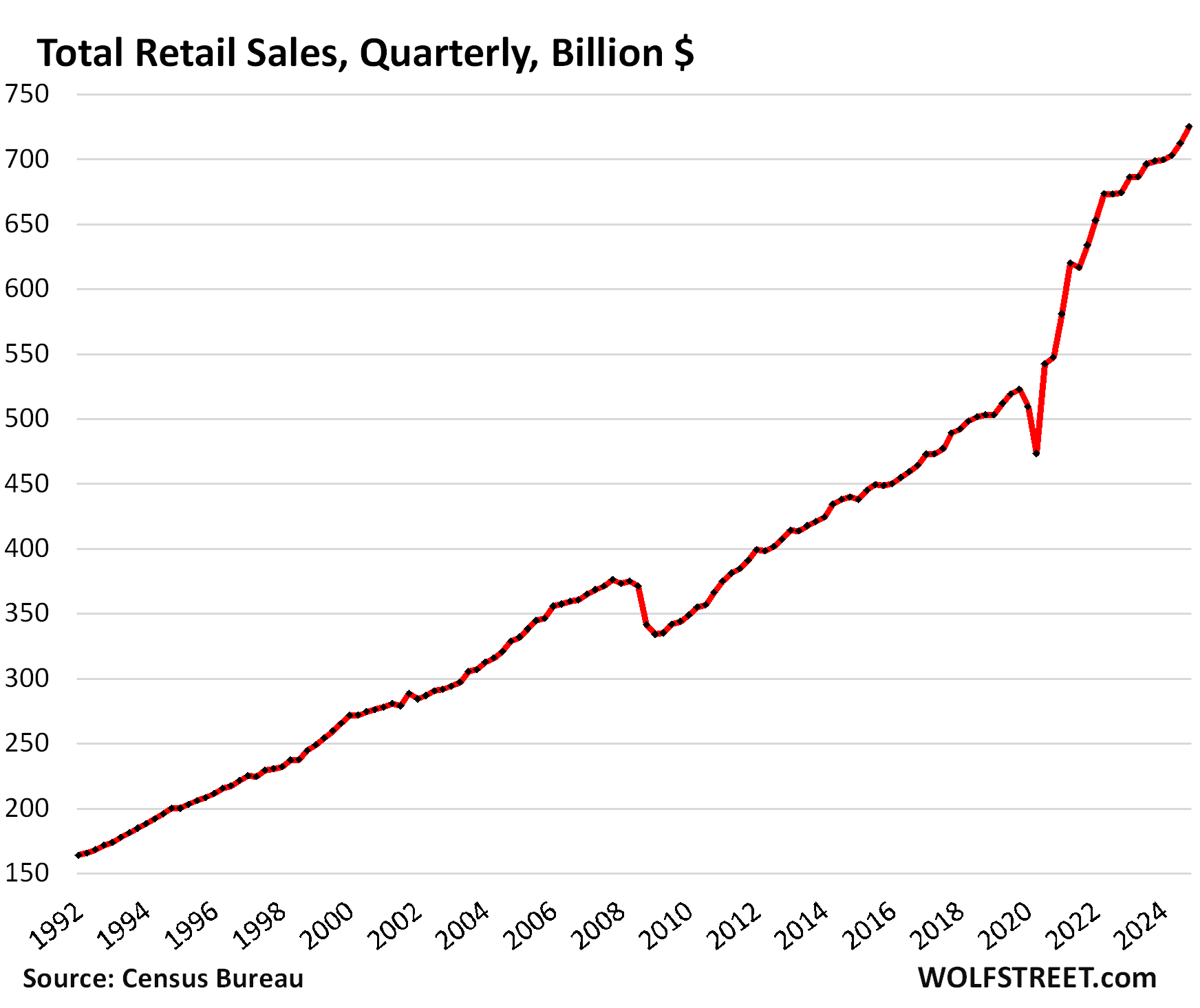 Brick and mortar retail sales at indoor malls are dying — that’s been going on for years. Big indoor malls have been dying in large numbers, and they will vanish as malls, they have huge parking lots and easy-to-tear-down buildings that can be redeveloped into housing, etc. That’s already happening on a large scale, including in San Francisco. Ecommerce is booming. Grocery stores, auto dealers, and gas stations are doing OK. Restaurants have been growing their sales at a sharp rate. Strip malls anchored by grocery stores are doing well. Overall retail sales have been growing sharply.