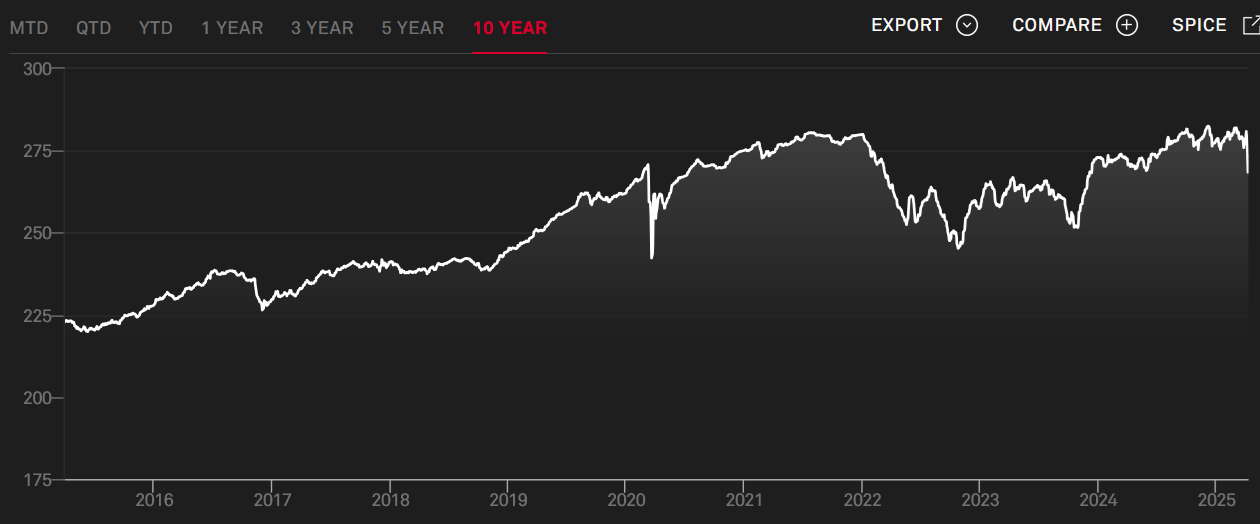 Right now, I like my three month T-bills which yield almost as much as ten year Treasuries (4.336% vs. 4.497%). The twenty year at 4.941% is the only other Treasury that is interesting, but needs to be higher for me to jump on it. With three month T-bills I do have to think about what the Fed thinks. I give the Fed some credit for pretty much staying out of the tariff fight, although Powell said he thinks tariffs will increase inflation.