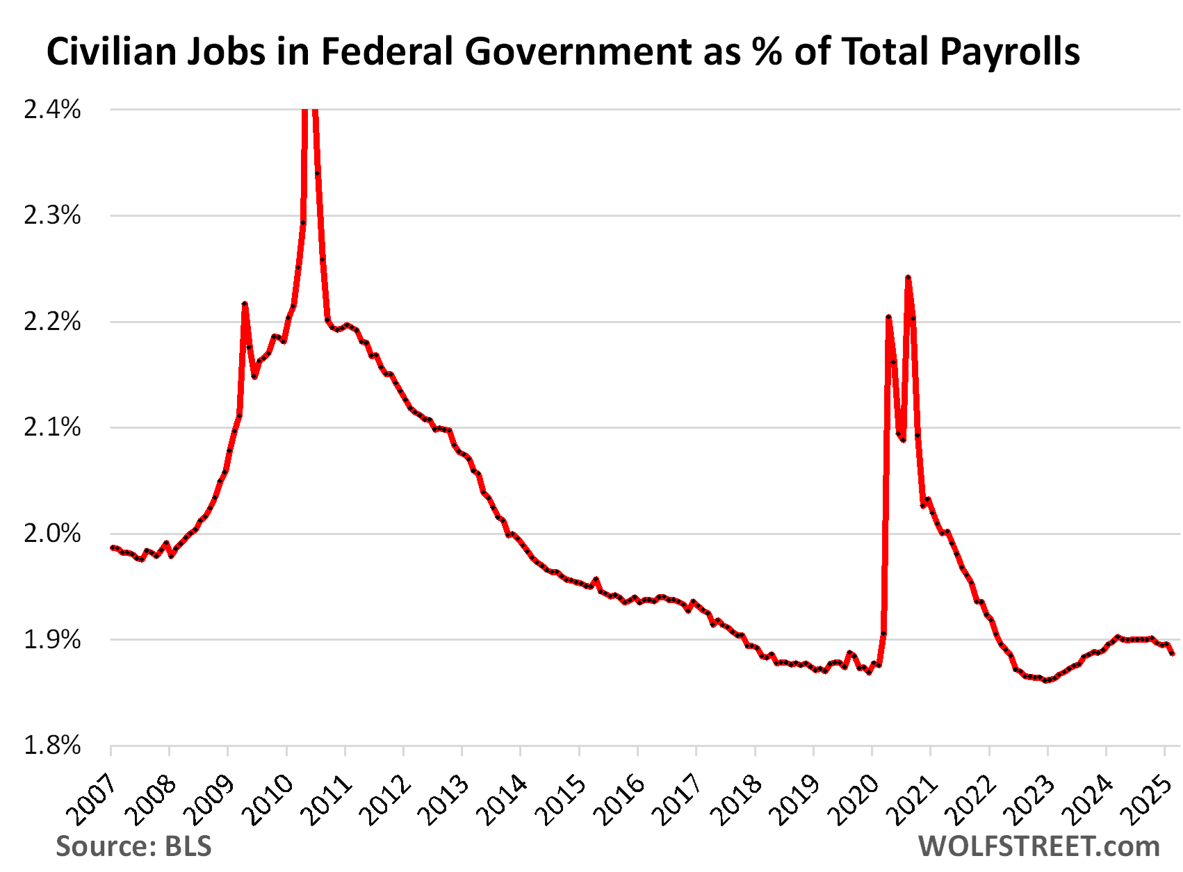 The three-month average, which irons out the month-to-month squiggles and revisions, declined to 1.67 million, the lowest since August 2024 (red line). This data from the Job Openings and Labor Turnover Survey (JOLTS) by the Bureau of Labor Statistics today is based on surveys of about 21,000 work locations.