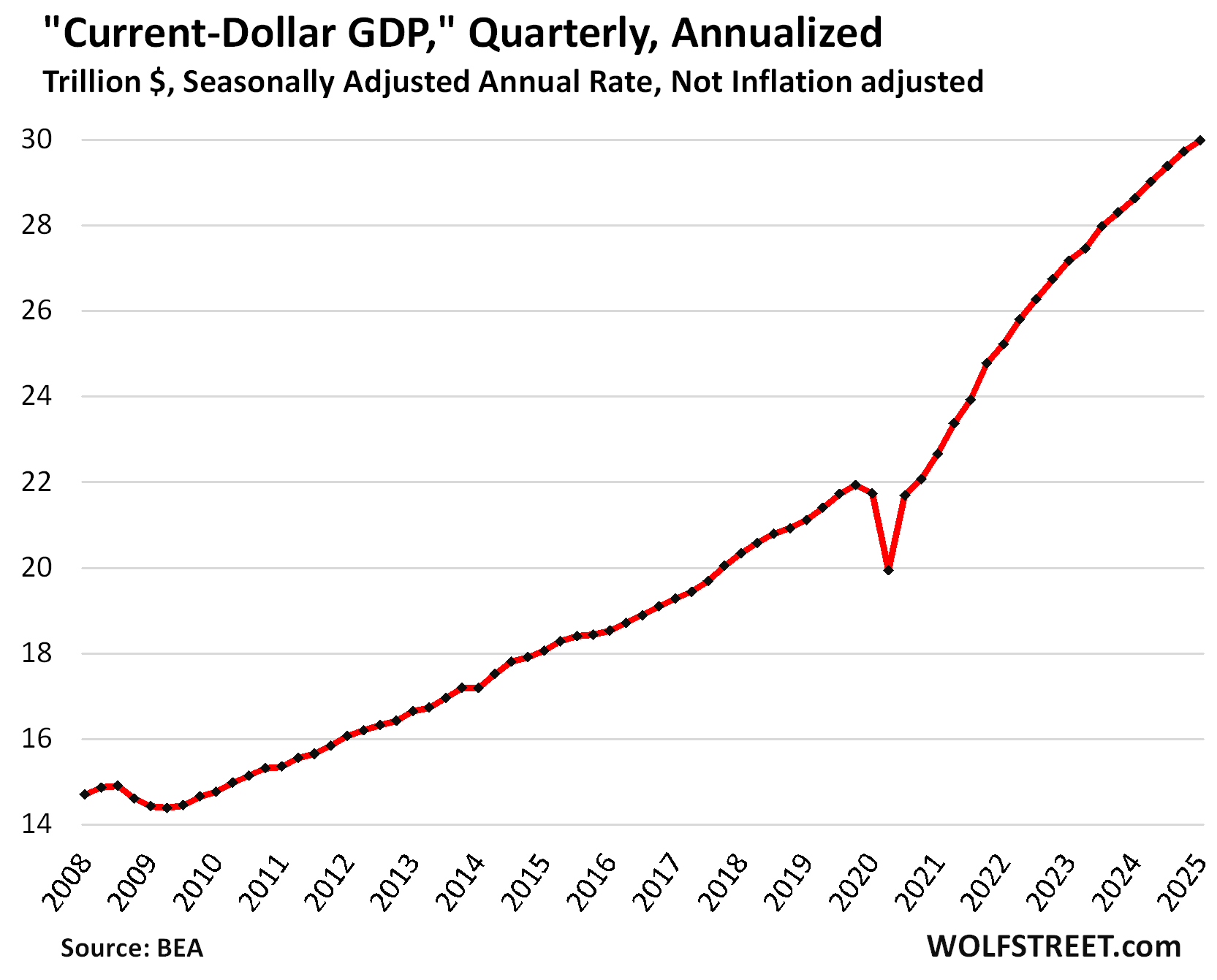 Not adjusted for inflation, “current-dollar” GDP grew by an annual rate of 3.5% to $30.0 trillion, measured in current dollars, not inflation-adjusted dollars. This sometimes called “nominal GDP” represents the actual size of the US economy in today’s dollars and forms the basis for the Debt-to-GDP ratio (further down) and similar GDP-based ratios.