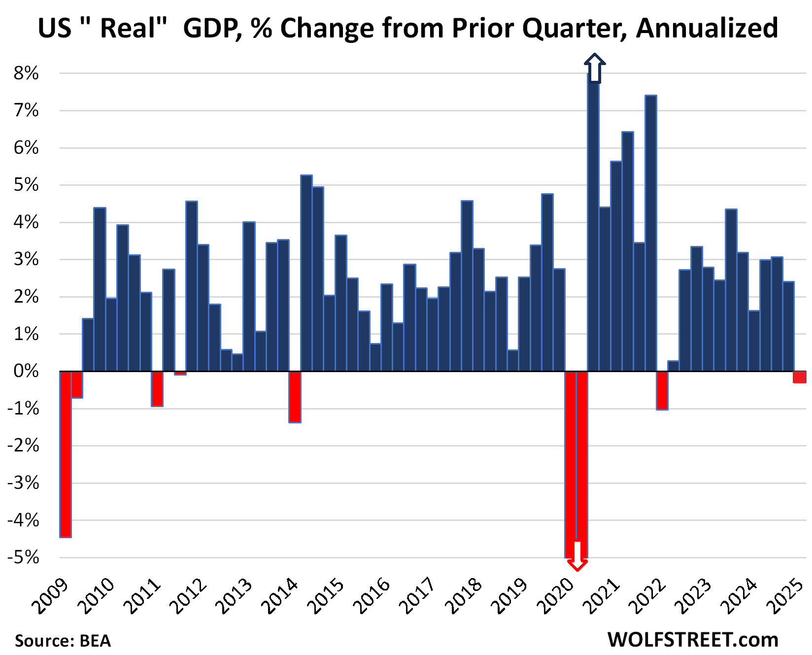 GDP dipped by an annualized rate of 0.3%, adjusted for inflation (“real GDP”), after growth rates of 2.4% in Q4, 3.1% in Q3, and 3.0% in Q2.