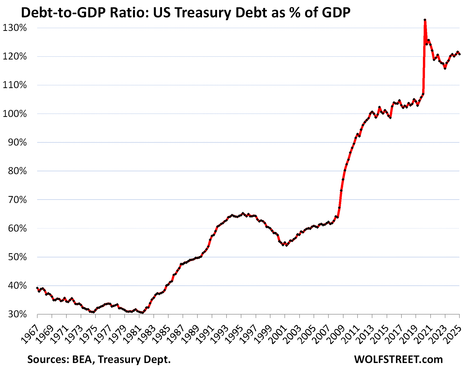 The spike in 2020 occurred as GDP collapsed during the lockdown while the Treasury debt jumped on the government’s free-money-giveaway spree.