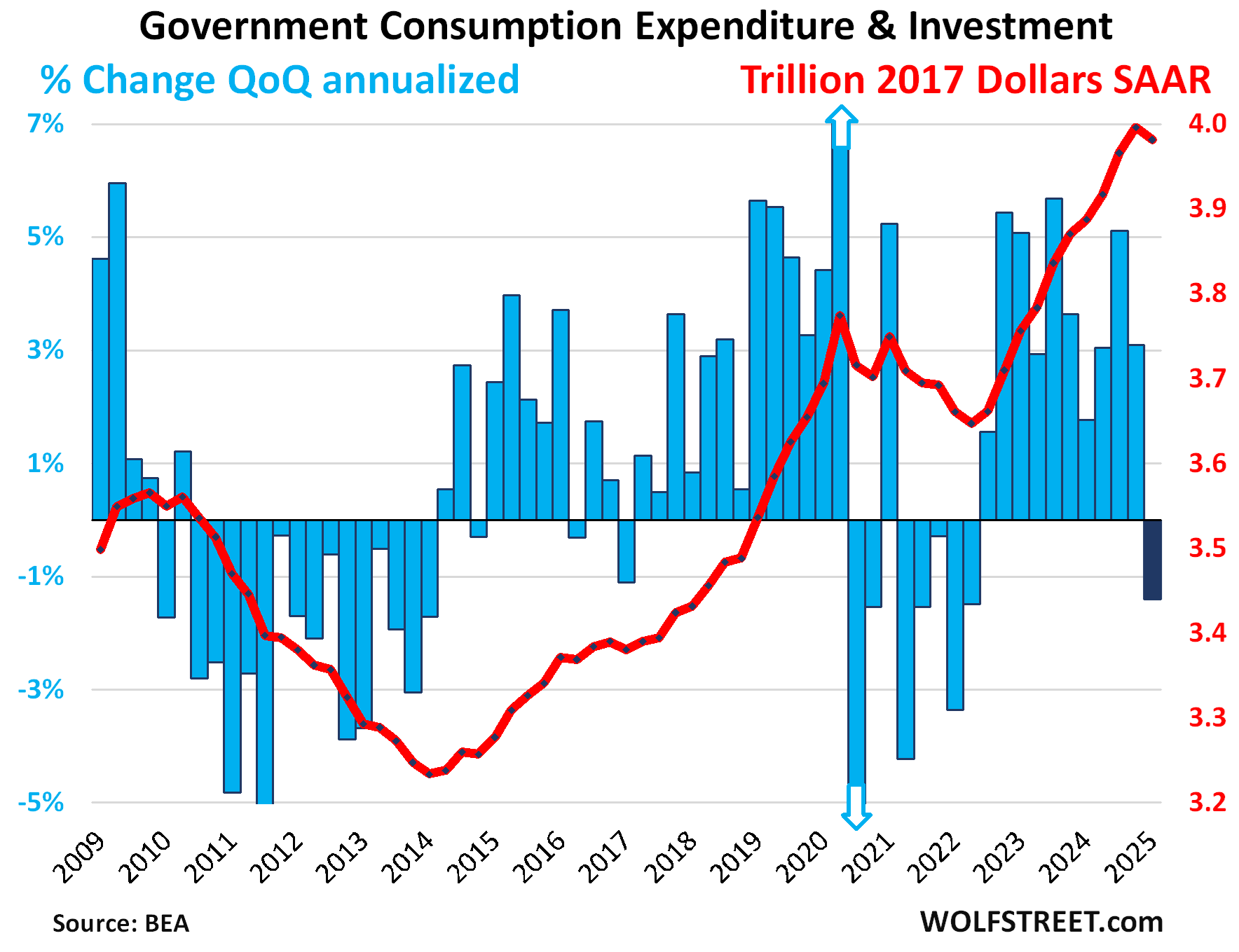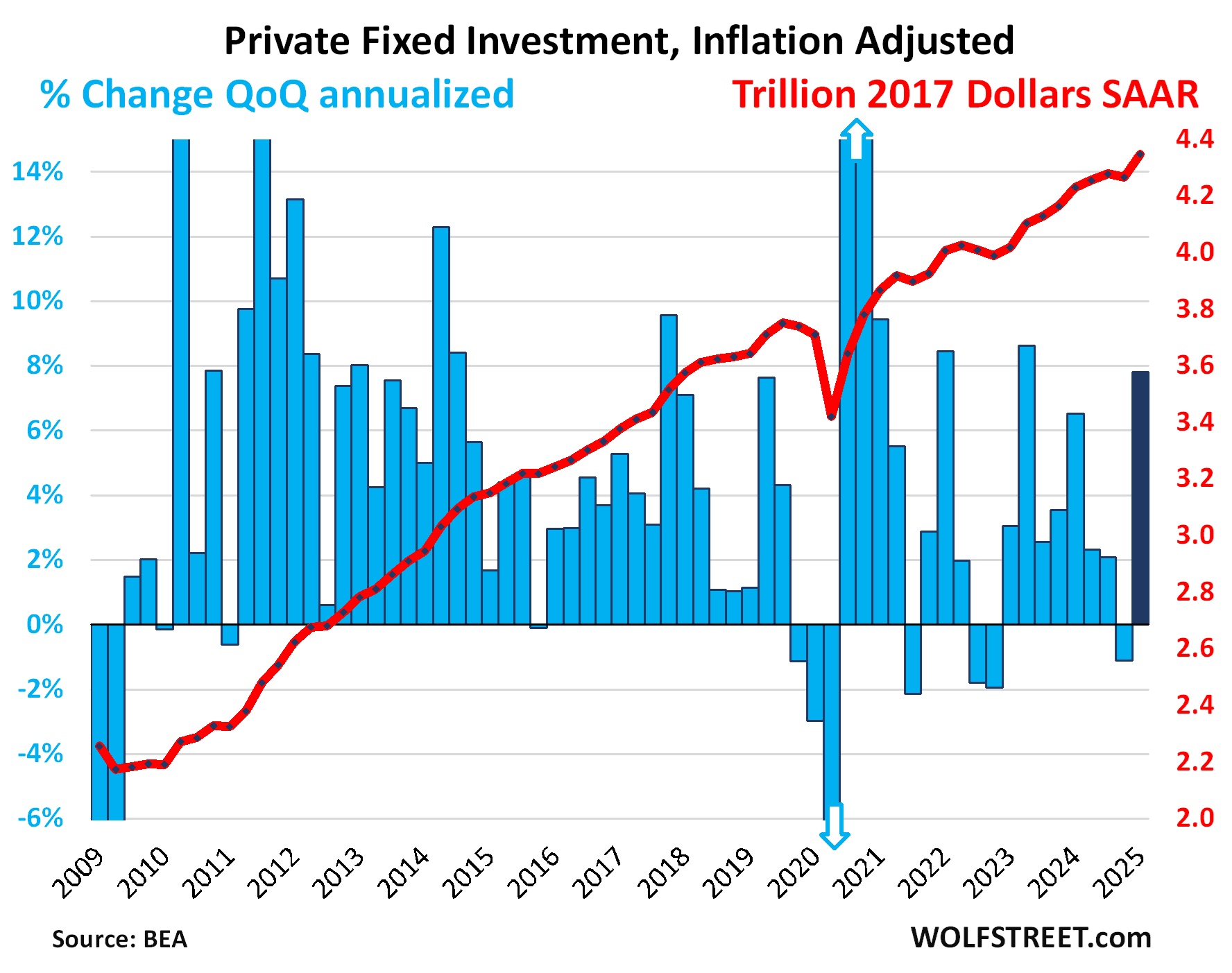 The blue columns show the growth rates (left axis), the red line shows the dollars (right axis), all in seasonally adjusted annual rates (SAAR):