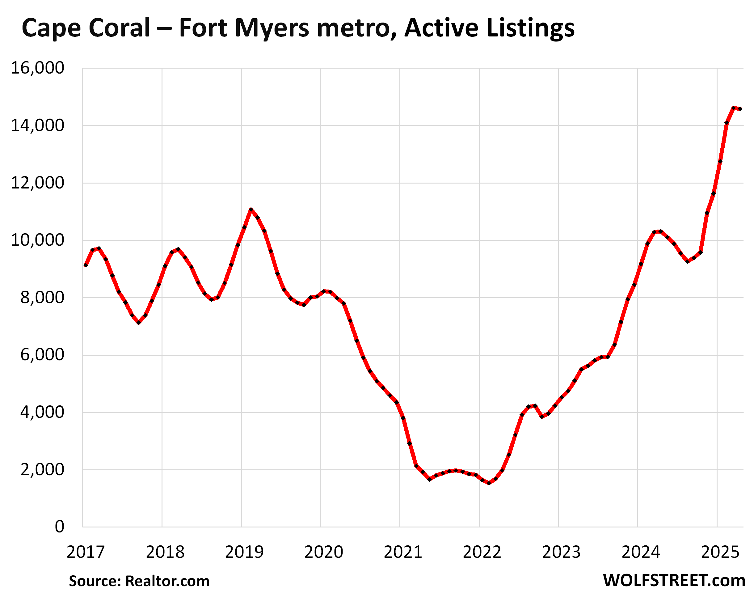 Cape Coral-Fort Myers metro: Active listings spiked by 41% year-over-year in April, to 14,580 homes, along with March the highest in the data from realtor.com going back to 2016, and 42% higher than in April 2019.