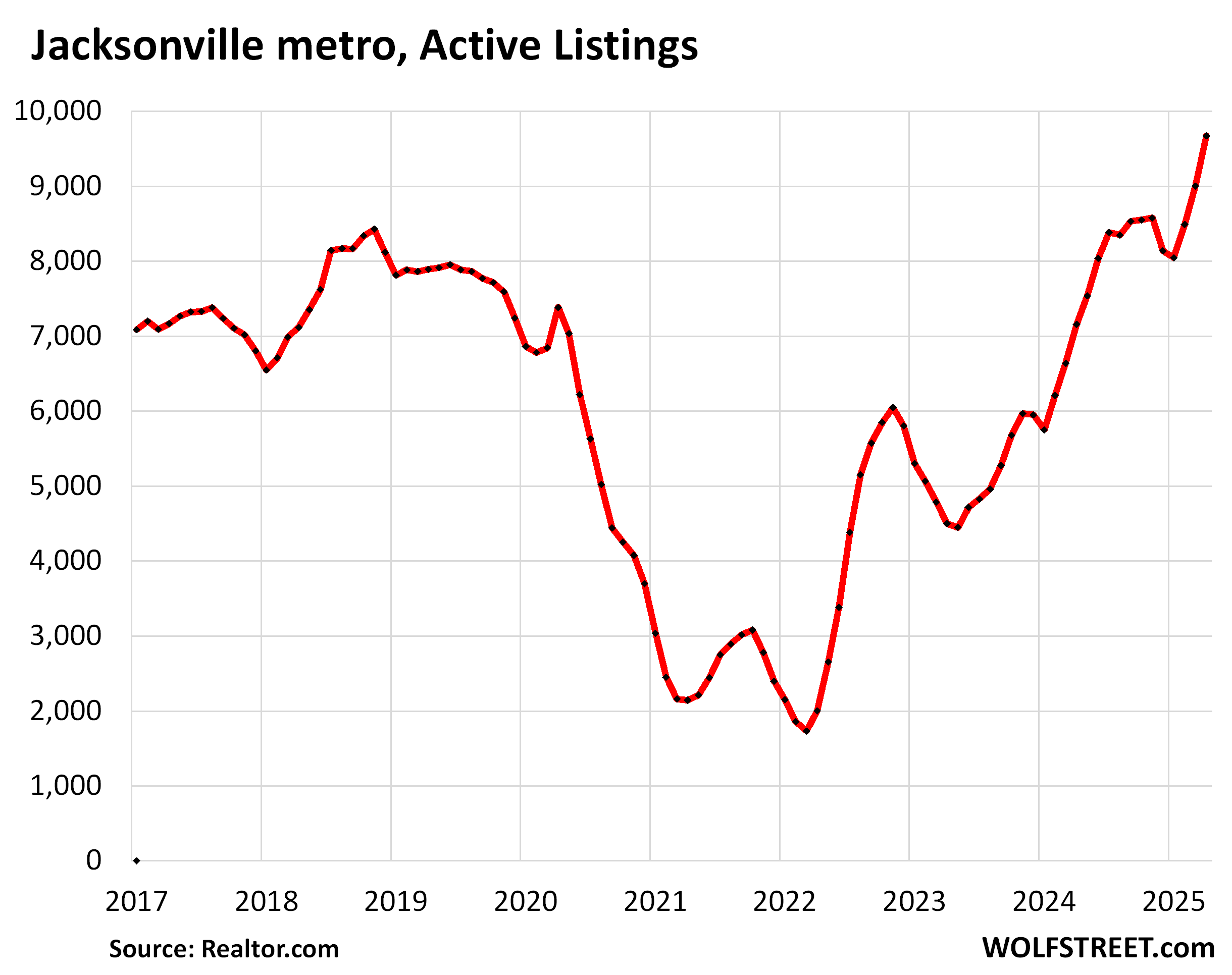 Jacksonville metro: Active listings spiked by 35% year-over-year in April, after three majestic month-to-month jumps in a row, similar what we’ve seen in the other metros, totaling 20%, to 9,676 homes, the highest in the data from realtor.com going back to 2016, and up 23% from April 2019.