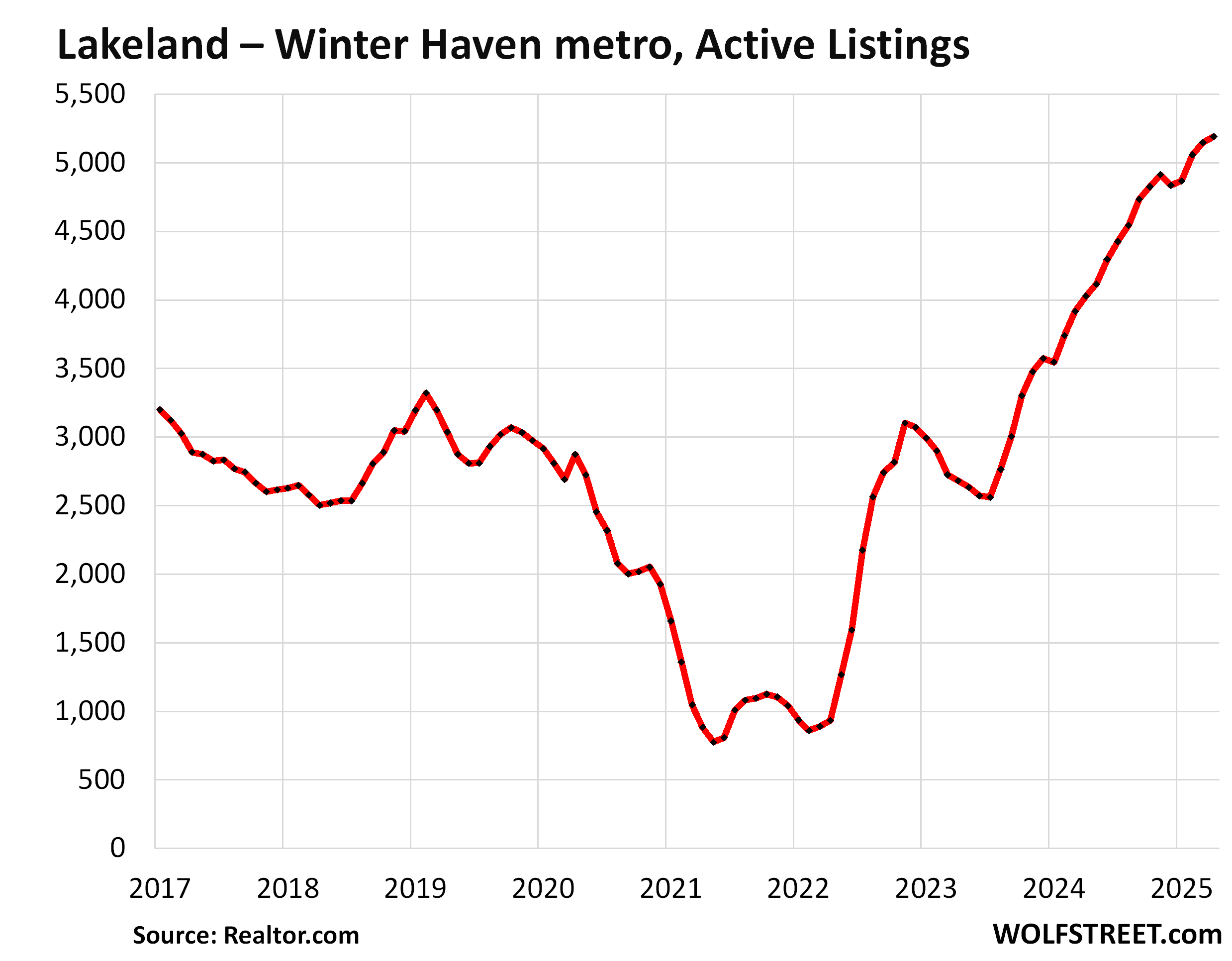 Lakeland-Winter Haven metro: Unsold inventory jumped by 29% year-over-year in April, to 5,191 homes, by very far the highest in the data from realtor.com going back to 2016. It was 71% higher than in April 2019, and 107% higher than in April 2018. Showing signs of a glut: