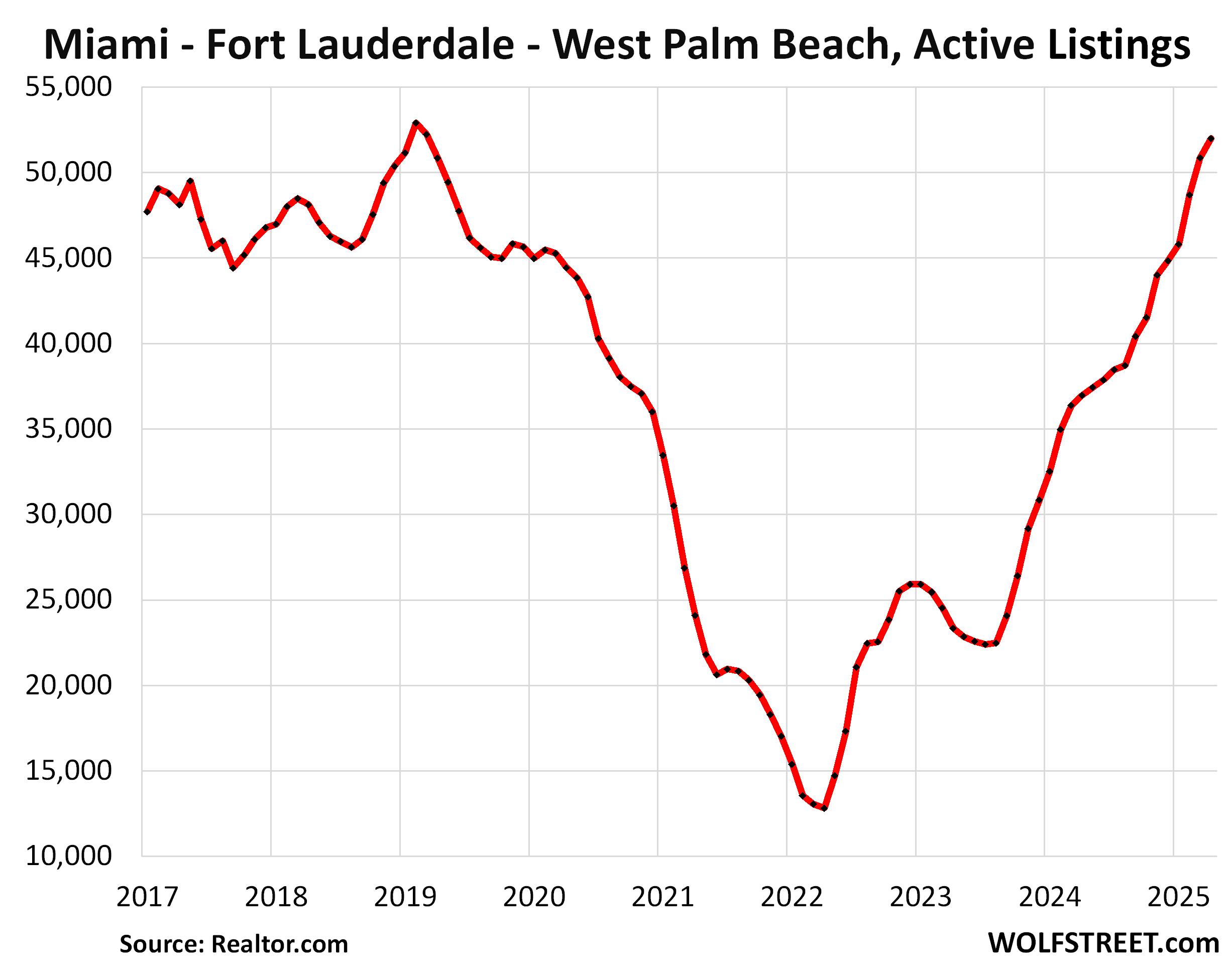 Unsold inventory of existing homes for sale is piling up in Florida at a stunning rate. Active listings jumped by 35% year-over-year in April, to 182,589 homes, by far the highest in the data from realtor.com going back to 2016, and was 23% higher than in April 2019. There’s a housing shortage until there suddenly isn’t.