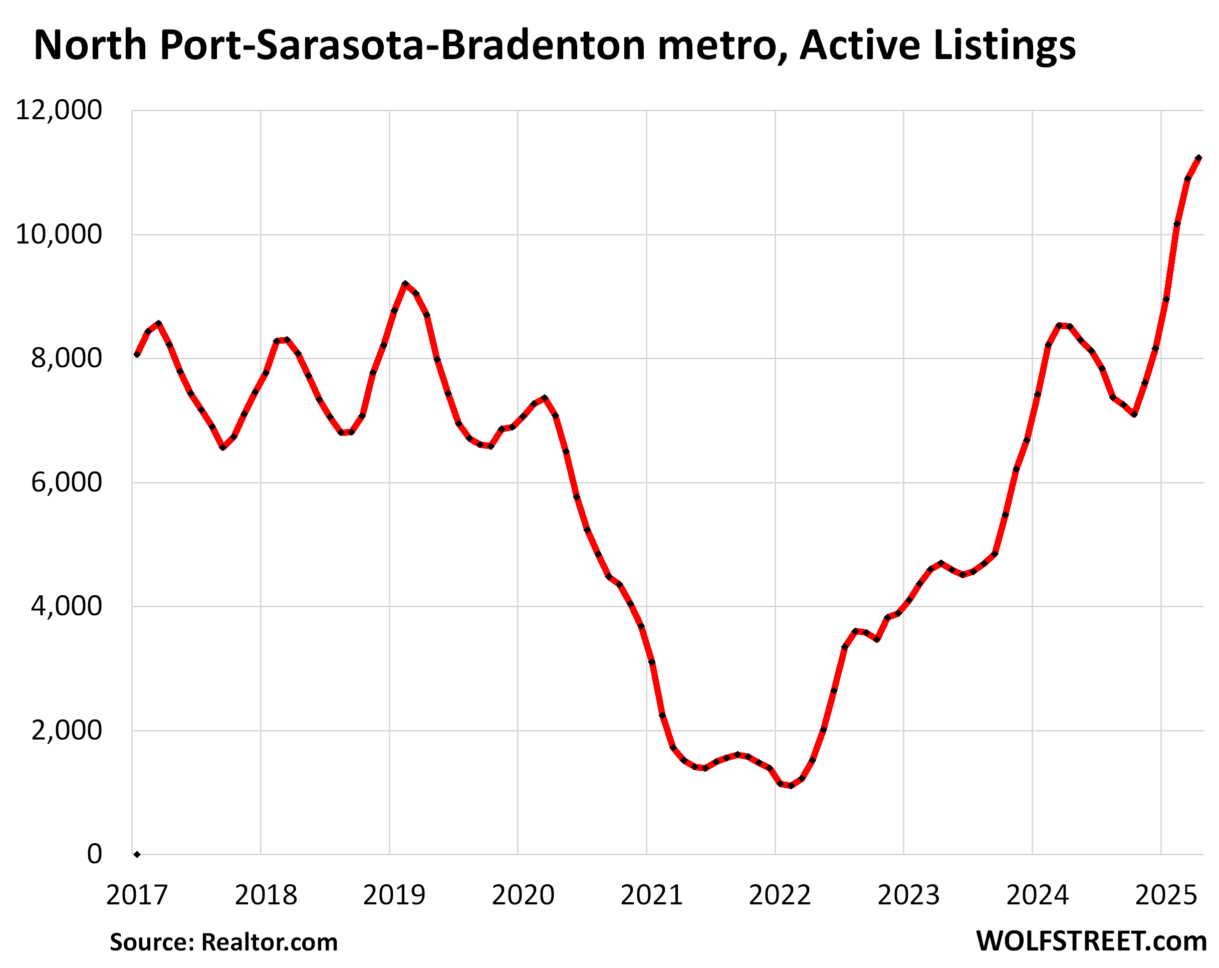 North Port-Sarasota-Bradenton metro: Active listings spiked by 32% year-over-year in April, after six majestic month-to-month jumps in a row totaling 58%, to 11,234 homes, the highest in the data from realtor.com going back to 2016, and up 29% from April 2019.