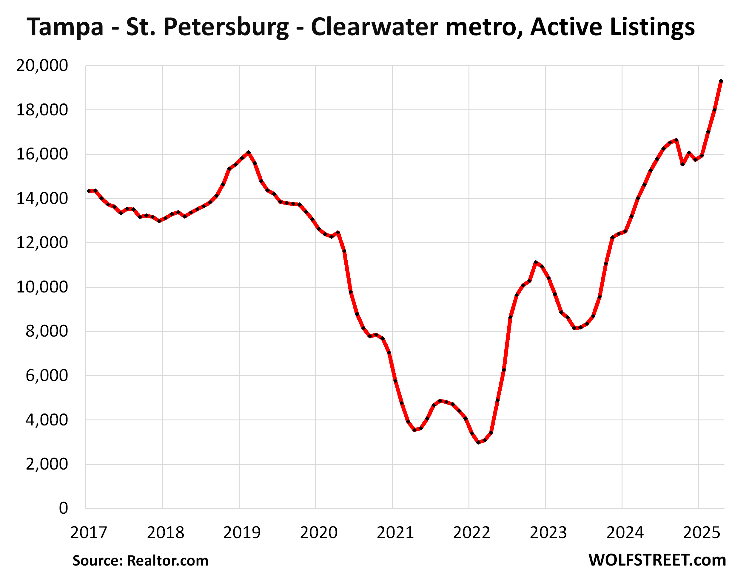 Tampa-St. Petersburg-Clearwater metro: Unsold inventory jumped by 32% year-over-year in April, after three majestic month-to-month jumps in a row totaling 21%, to 19,310 homes, the highest in the data from realtor.com going back to 2016. Unsold inventory was 31% higher than in April 2019.