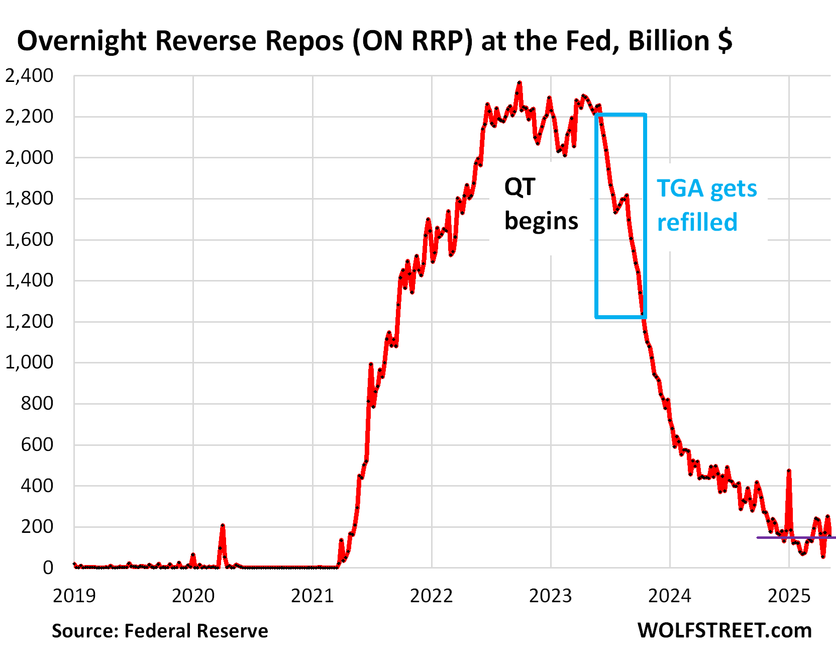 And if the TGA gets drawn down to near-zero again, and if Treasury then issues $800 billion in additional T-bills over a few months later this year and early next year, ON RRPs can only provide a small portion of that cash, and the rest of the cash to buy those T-bills will come from the financial markets and the banking system’s reserve balances at the Fed.- Wolf