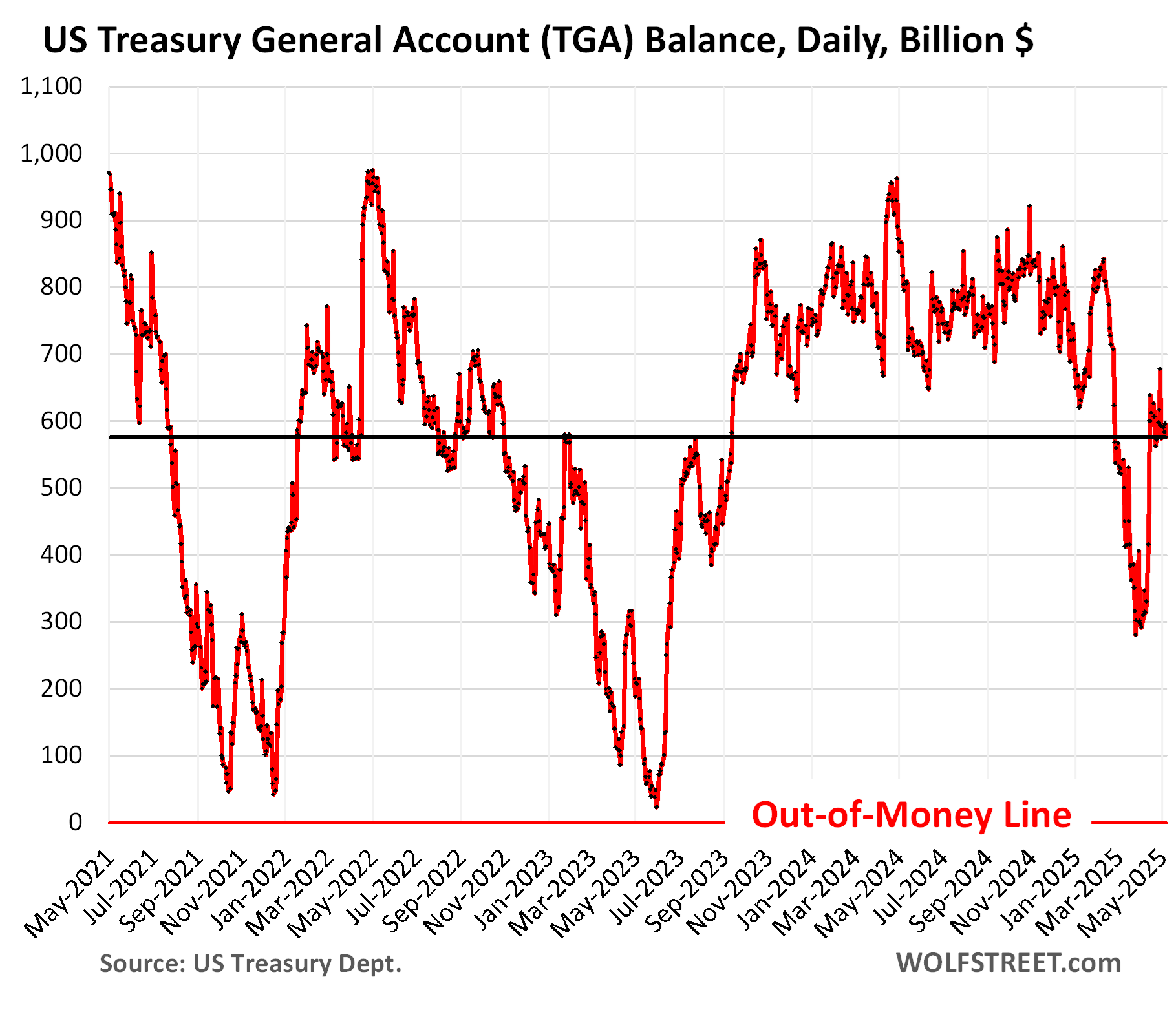 Back on April 3, 2025, cash in the government’s checking account, the Treasury General Account (TGA) at the Federal Reserve Bank of New York, had plunged to $296 billion, from over $800 billion in mid-February. Then came the flood of tax receipts, and by April 16, the TGA balance had shot up to $639 billion, and by April 30, to $678 billion. Then, the balance began to decline again.