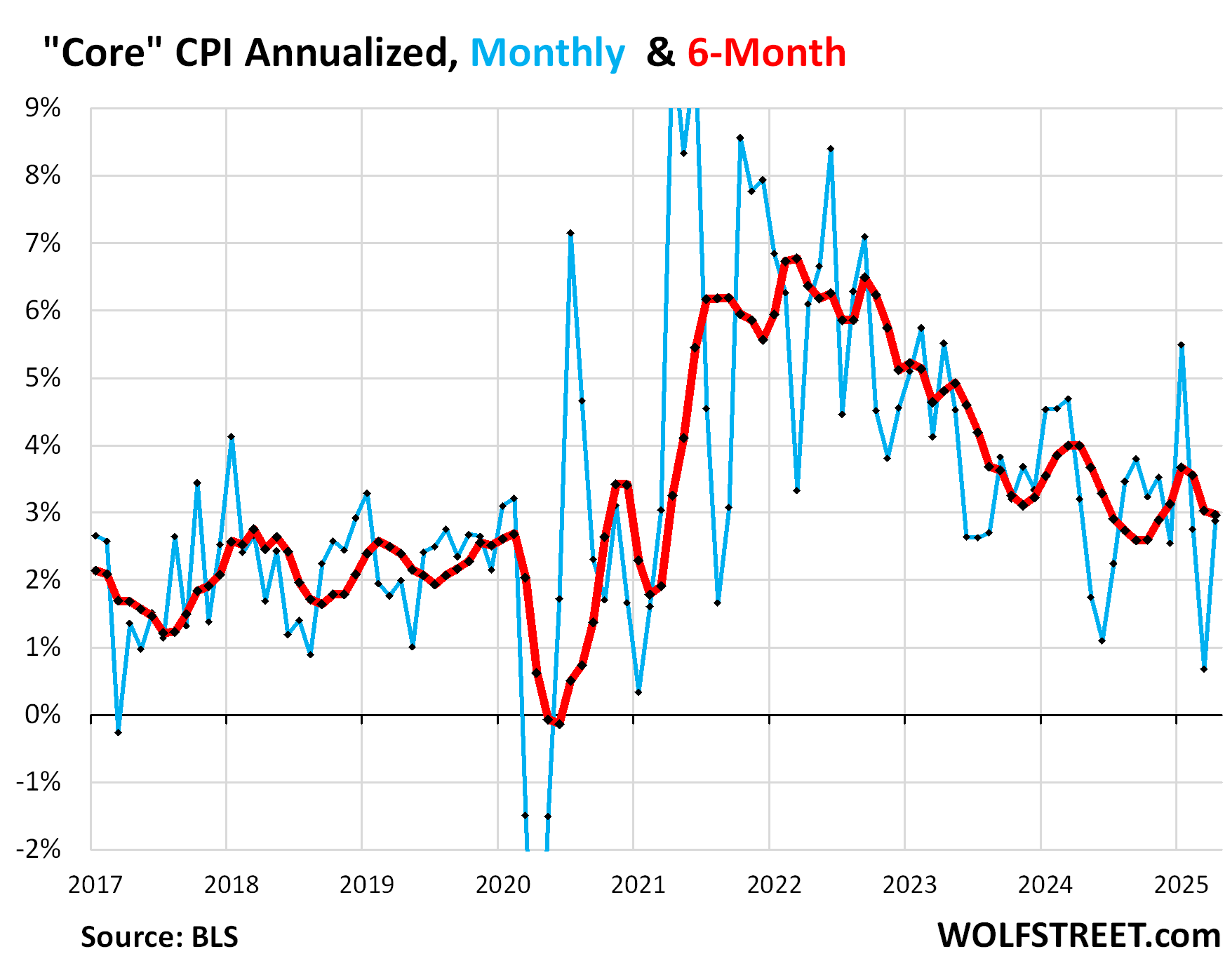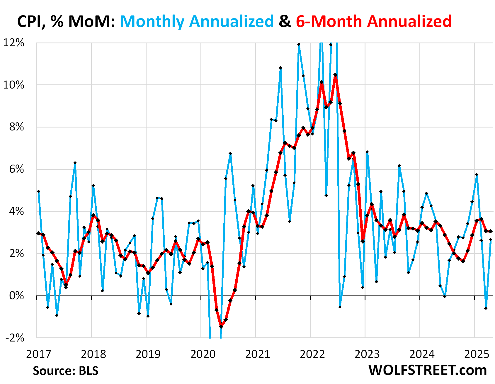 This bounce-back from the drop caused the 6-month CPI to rise by 3.1% annualized, same as in March (red in the chart):