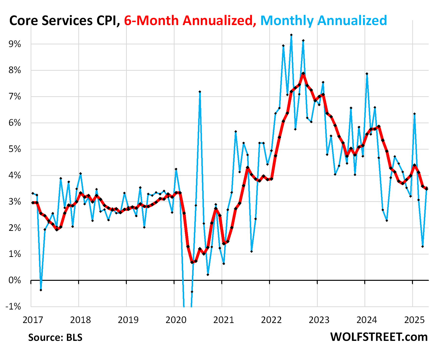 The 6-month core services CPI rose by 3.5% annualized, a slight deceleration from March (red).