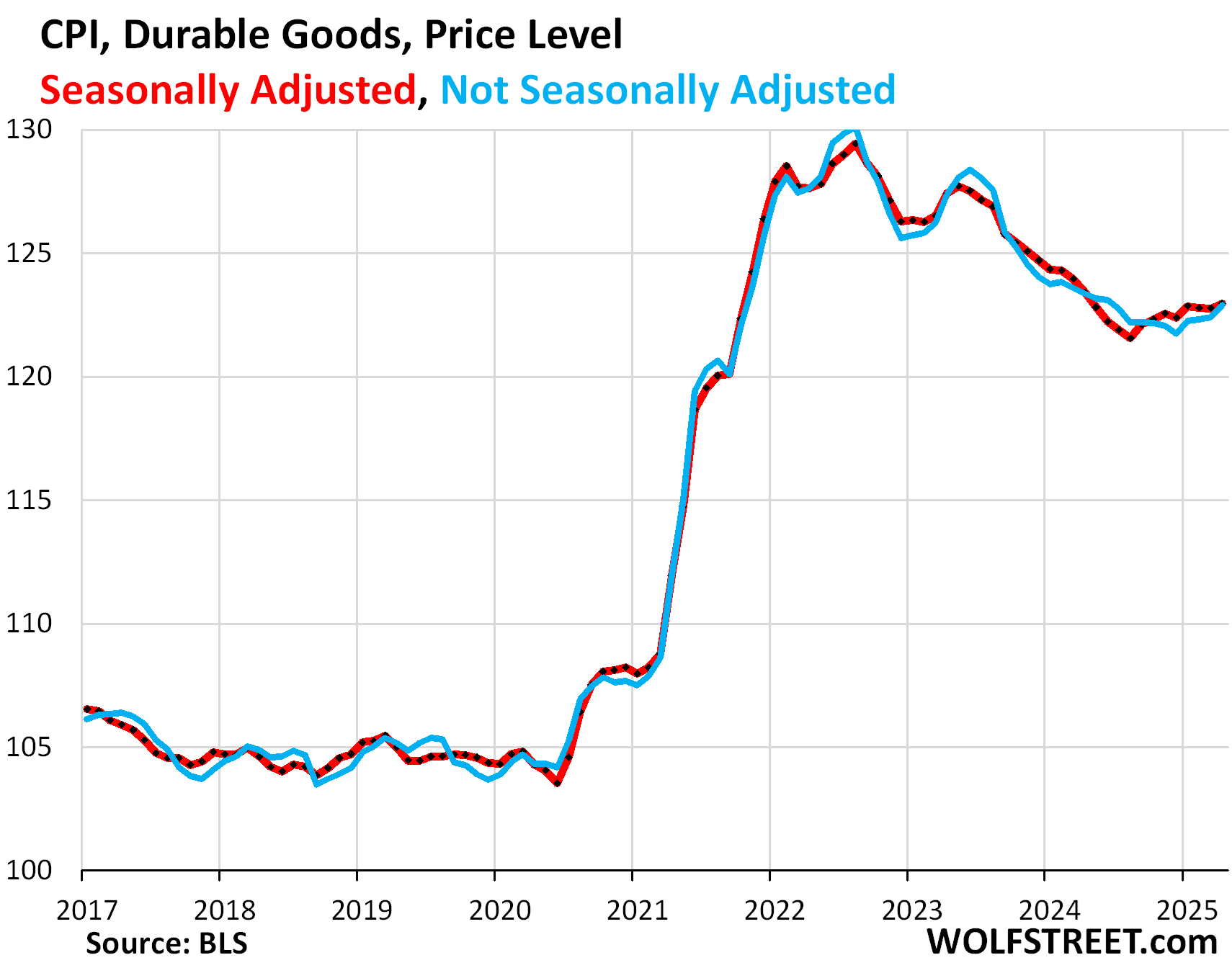 Durable Goods overall – dominated by new and used vehicles – experienced a huge spike of inflation from mid-2020 through mid-2022. And then prices declined (deflation) across the board through August 2024. In September 2024, prices began to meander higher, and April was the latest installment in that series. There is so far no sign of tariffs getting passed through to consumers. But the explosion of prices in 2021 and 2022 was historic: