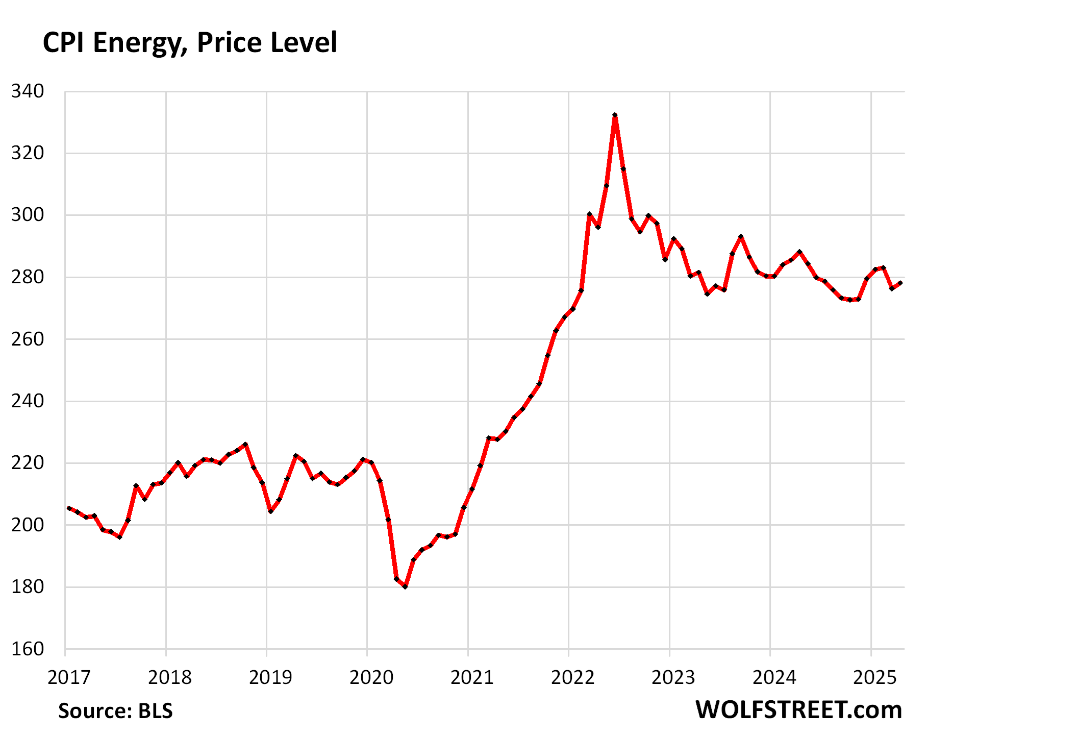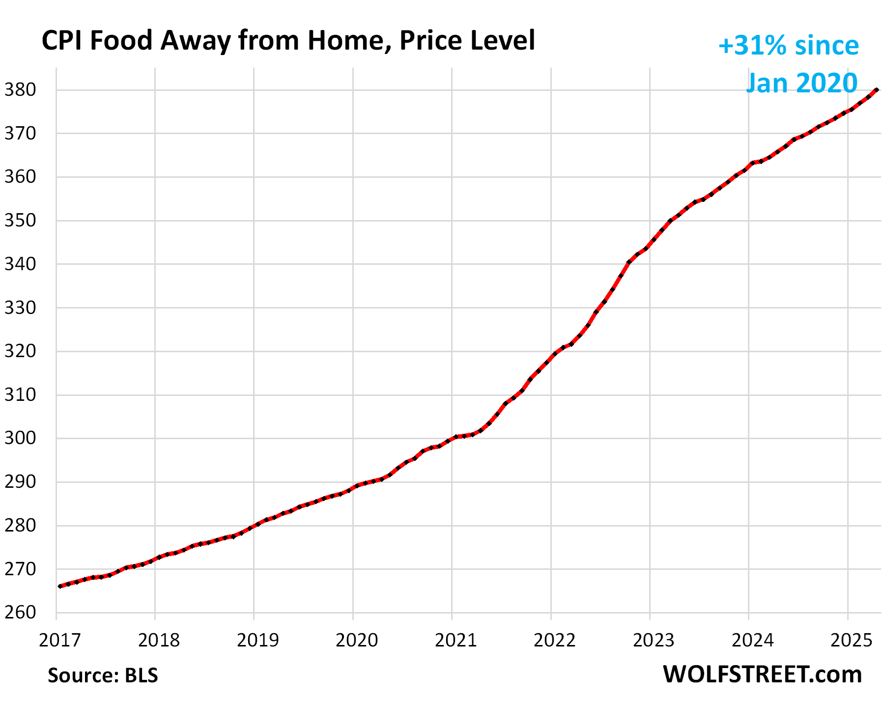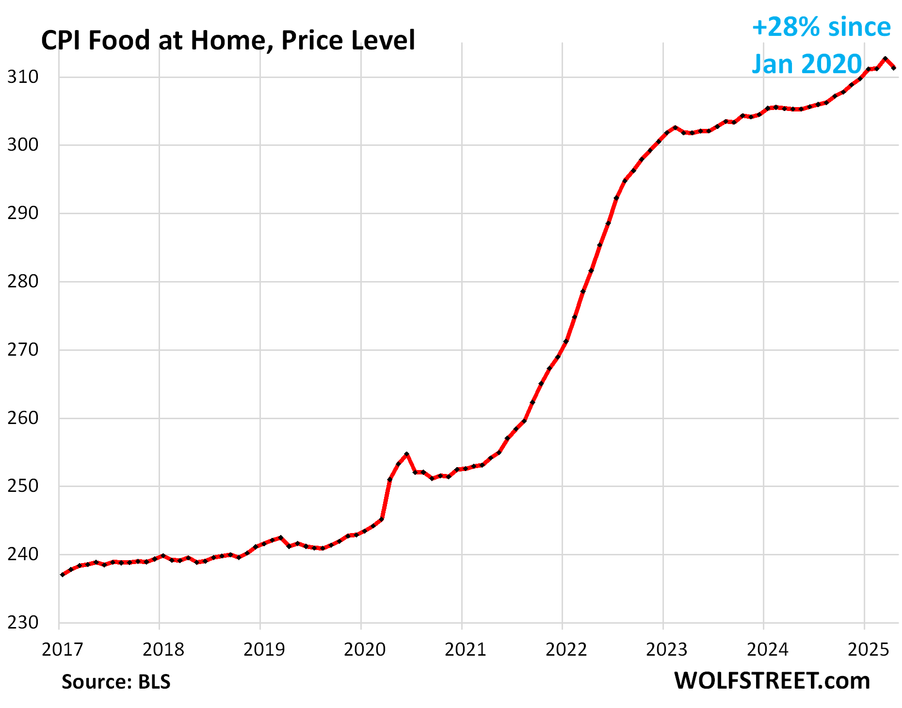 Year-over-year, the index rose by 5.6%. Since January 2020, it has exploded by 42%. This chart shows the price level, not the year-over-year percentage change: