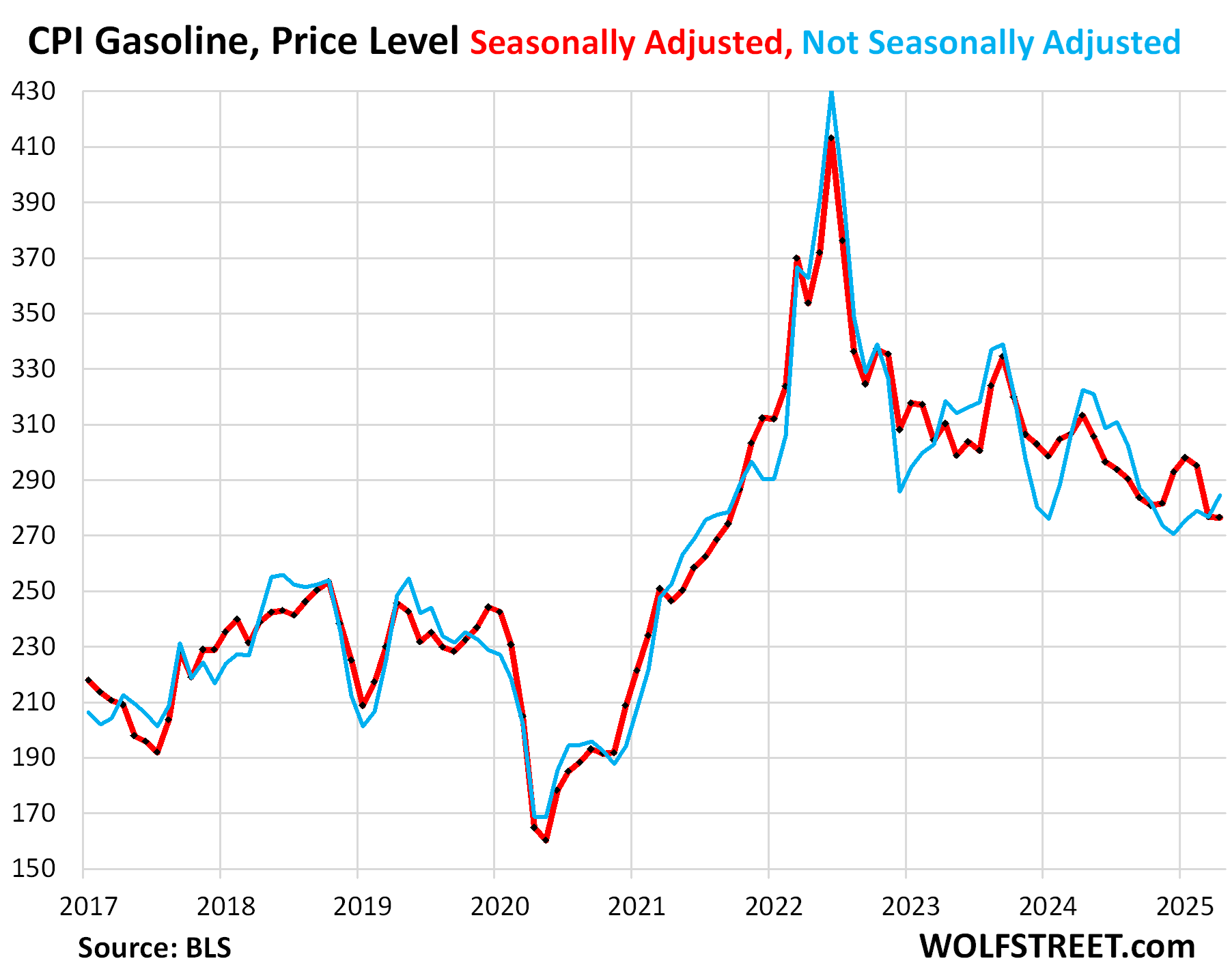 The CPI for gasoline, not seasonally adjusted, rose in April from March, but it normally rises about that much in April, and so on a seasonally adjusted basis, the index was roughly unchanged and remained at the lowest price level since September 2021.
