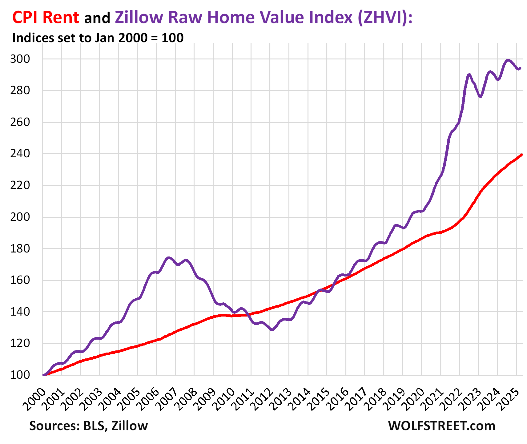 Rent inflation vs. home-price inflation: The red line in the chart below represents the CPI for Rent of Primary Residence as index value. The purple line represents Zillow’s “raw” (not seasonally adjusted) Home Value Index for the US through March. Both indexes are set to 100 for January 2000. But home-price changes vary by metro and range from steep declines to continued increases, see the 33 Most Splendid Housing Bubbles in America.