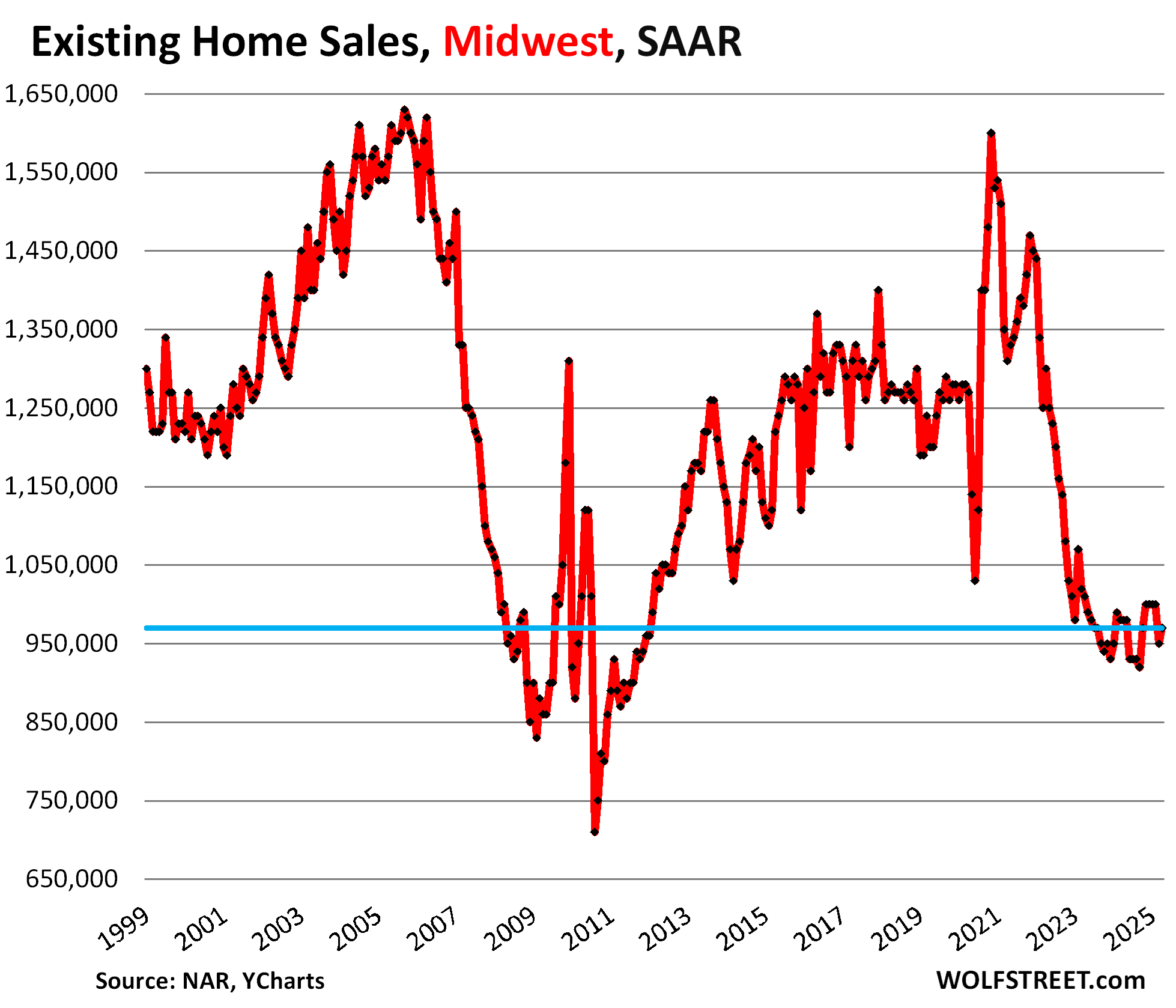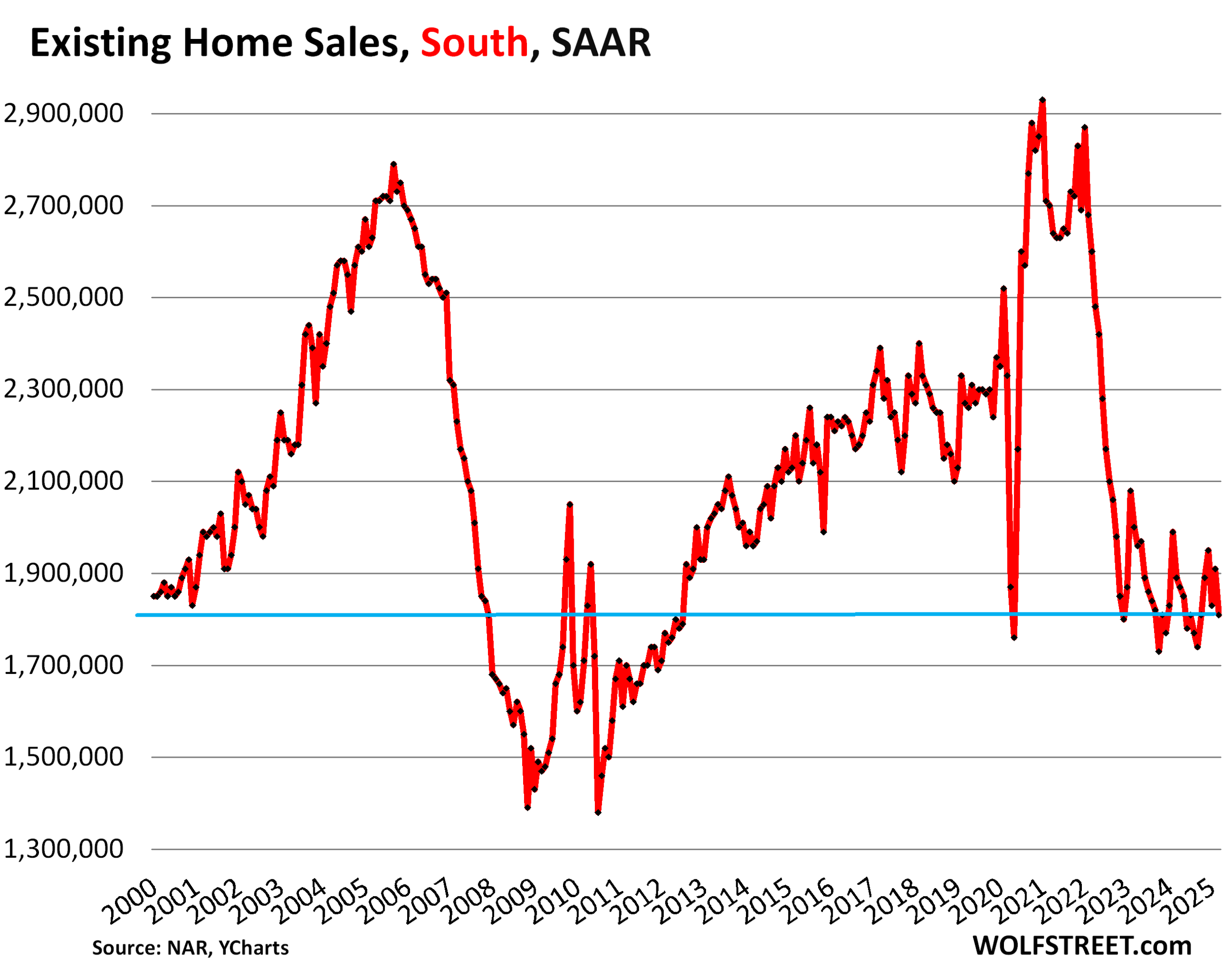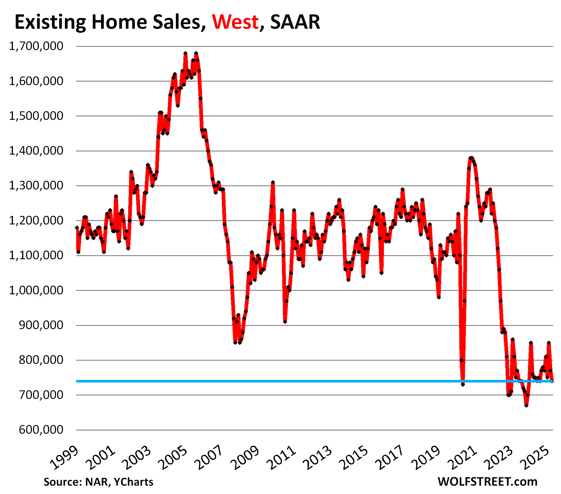 In the West, the seasonally adjusted annual rate of sales (SAAR) fell to 740,000 homes in April, the worst April in the data going back to the 1990s, and down by 1.3% from the already dismal sales in Aprils in 2024 and 2023: