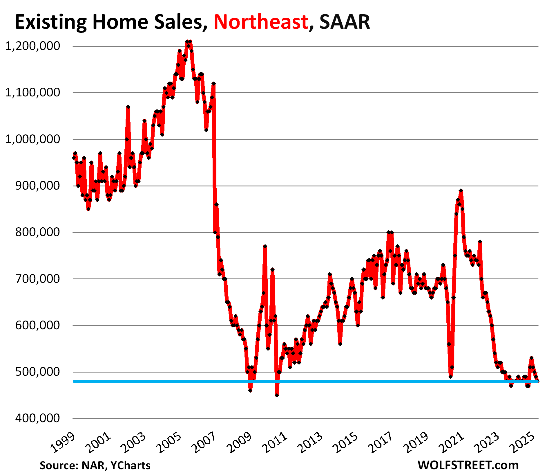 In the Northeast, sales dipped to 480,000 homes SAAR in April, same as in April 2024, both the worst Aprils since the 1990s.
