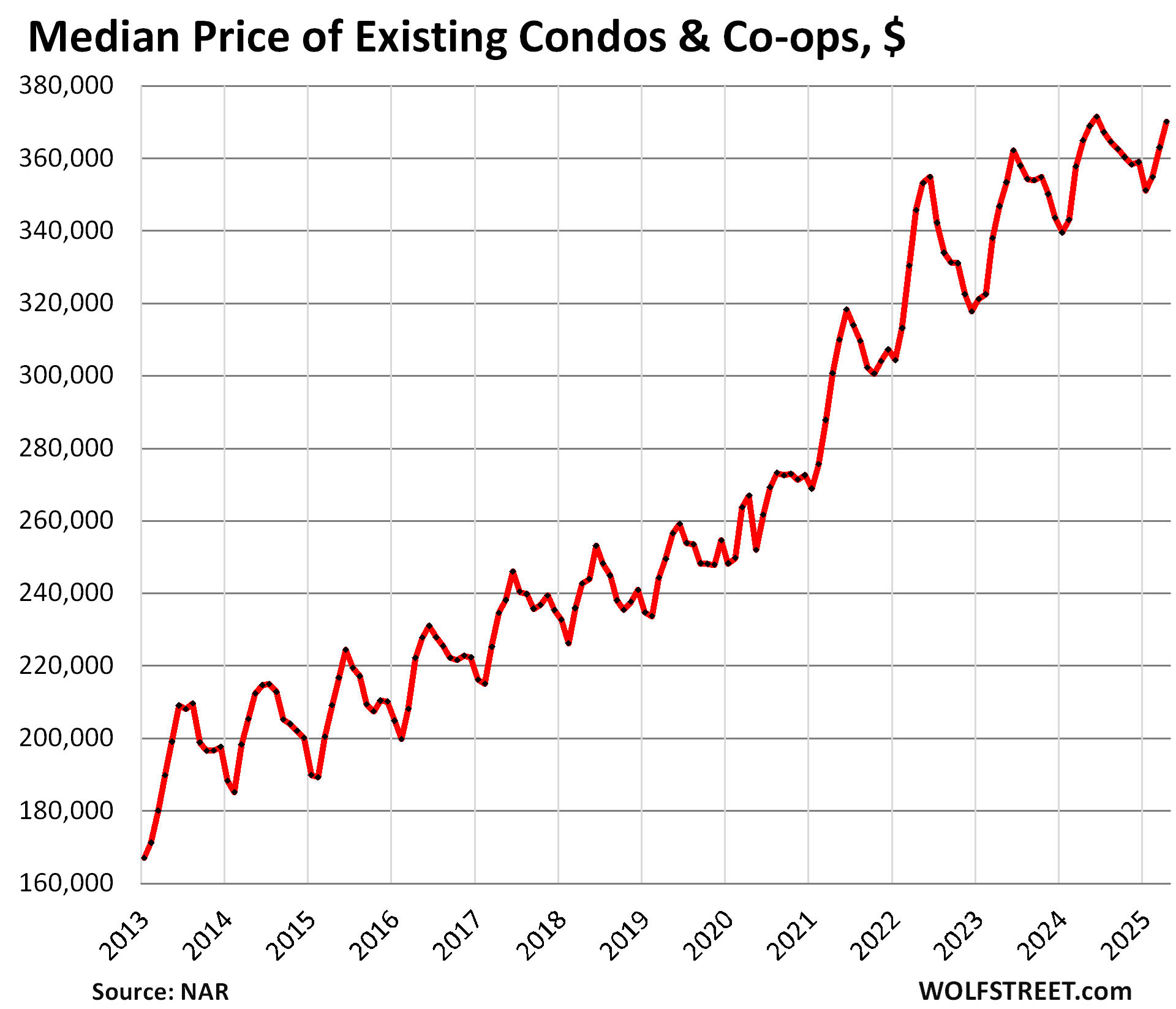 Condos and co-ops. The national median price rose to $370,000 in April, which whittled down the year-over-year gain to 1.4%, the fourth month in a row of narrowing year-over-year gains (from +4.5% in December).