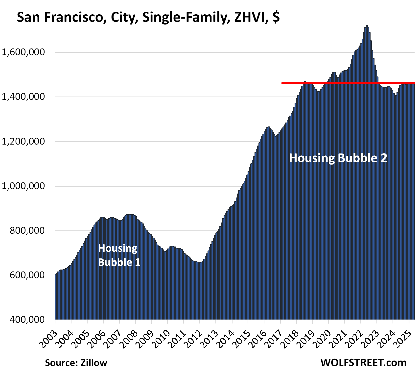 1. Zillow doesn’t offer median sold prices because it’s a garbage method for home prices. Zillow gives you the data I gave you above, that’s the single-family house prices of the ZHVI, seasonally adjusted. If you want single-family for the city itself, that’s it from Zillow.