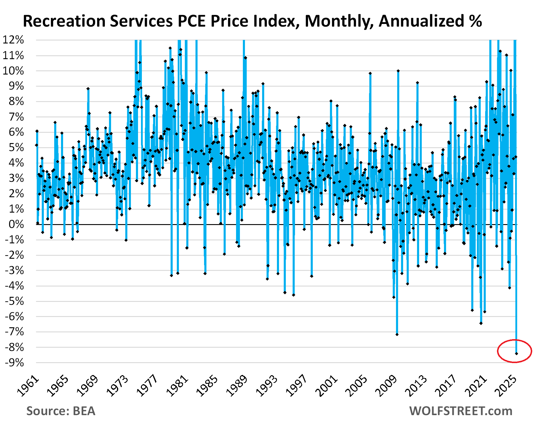 Another hero: Recreation Services PCE price index plunged month-to-month by 0.73% (-8.4% annualized), the biggest plunge in the entire history of the data going back to 1960. So this was another huge outlier.