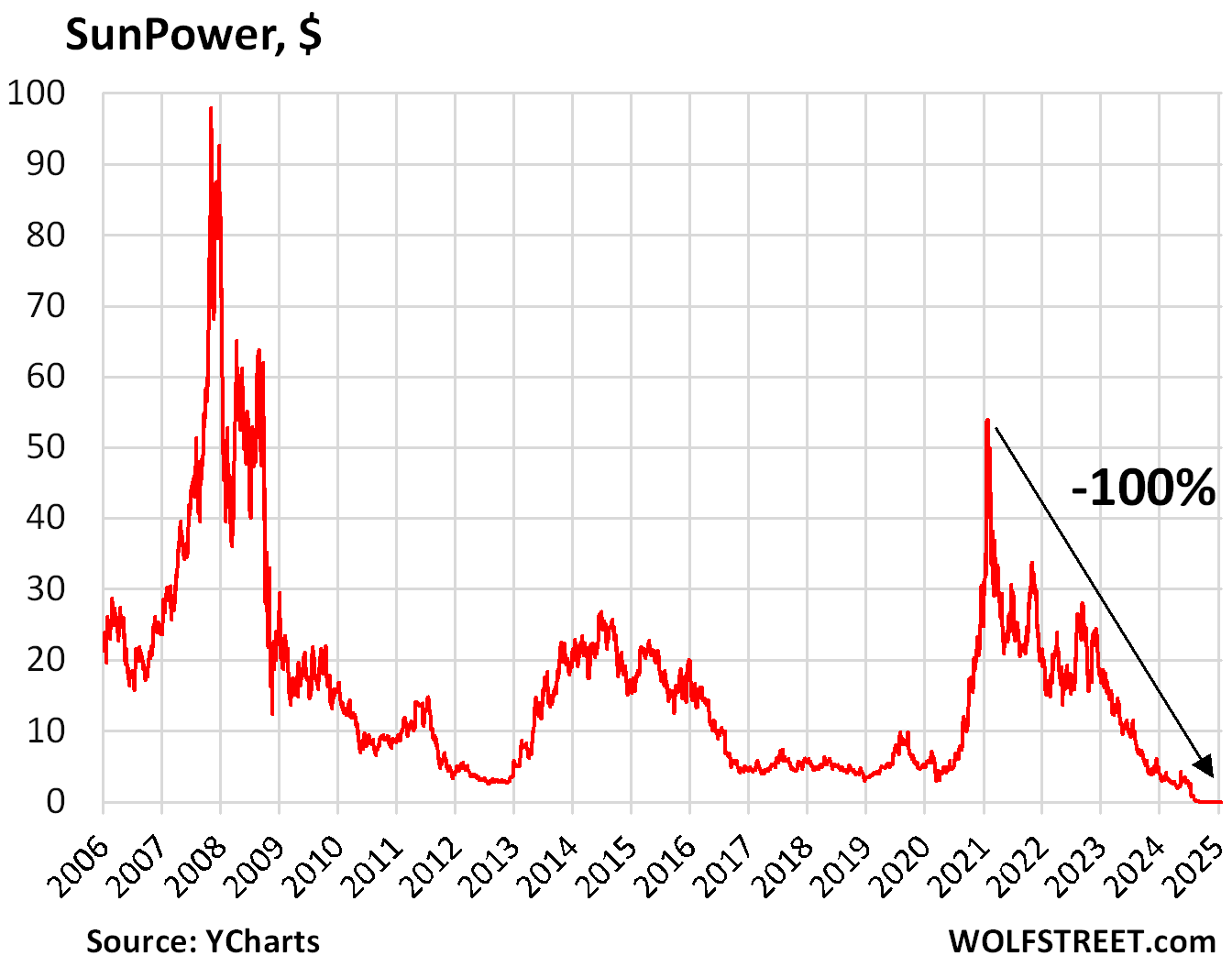 SunPower is already a goner. It filed for bankruptcy in August 2024. Most of its assets were acquired by solar SPAC Complete Solaria for $45 million (more in a moment), and SunPower’s shares got wiped out.
