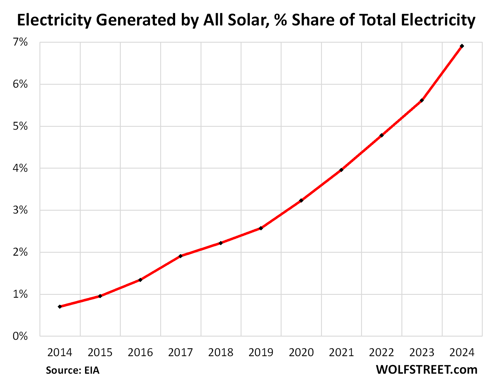 Solar power generation surged 26.9% in 2024 to 303,167 GWh, utility scale and rooftop solar combined. This is not “capacity” but electricity generated and used. Solar’s share ballooned to nearly 7% of the total electricity generated in 2024, surpassing hydropower [my report with charts: US Power Generation by Source in 2024].