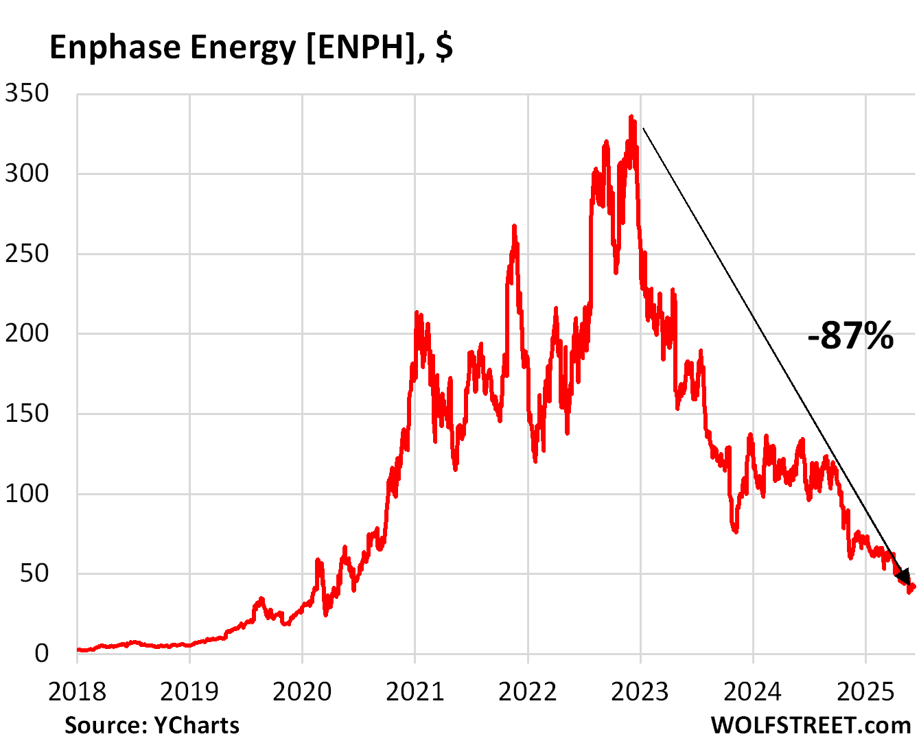Enphase Energy [ENPH], which makes equipment for residential and business solar and storage systems, and also EV chargers, went public via IPO in 2012. But then in 2019, stock took off and eventually, fueled by the free-money pandemic, multiplied by 48, to $336 in December 2022. Today, it closed at $43.26, down by 86% from that high.