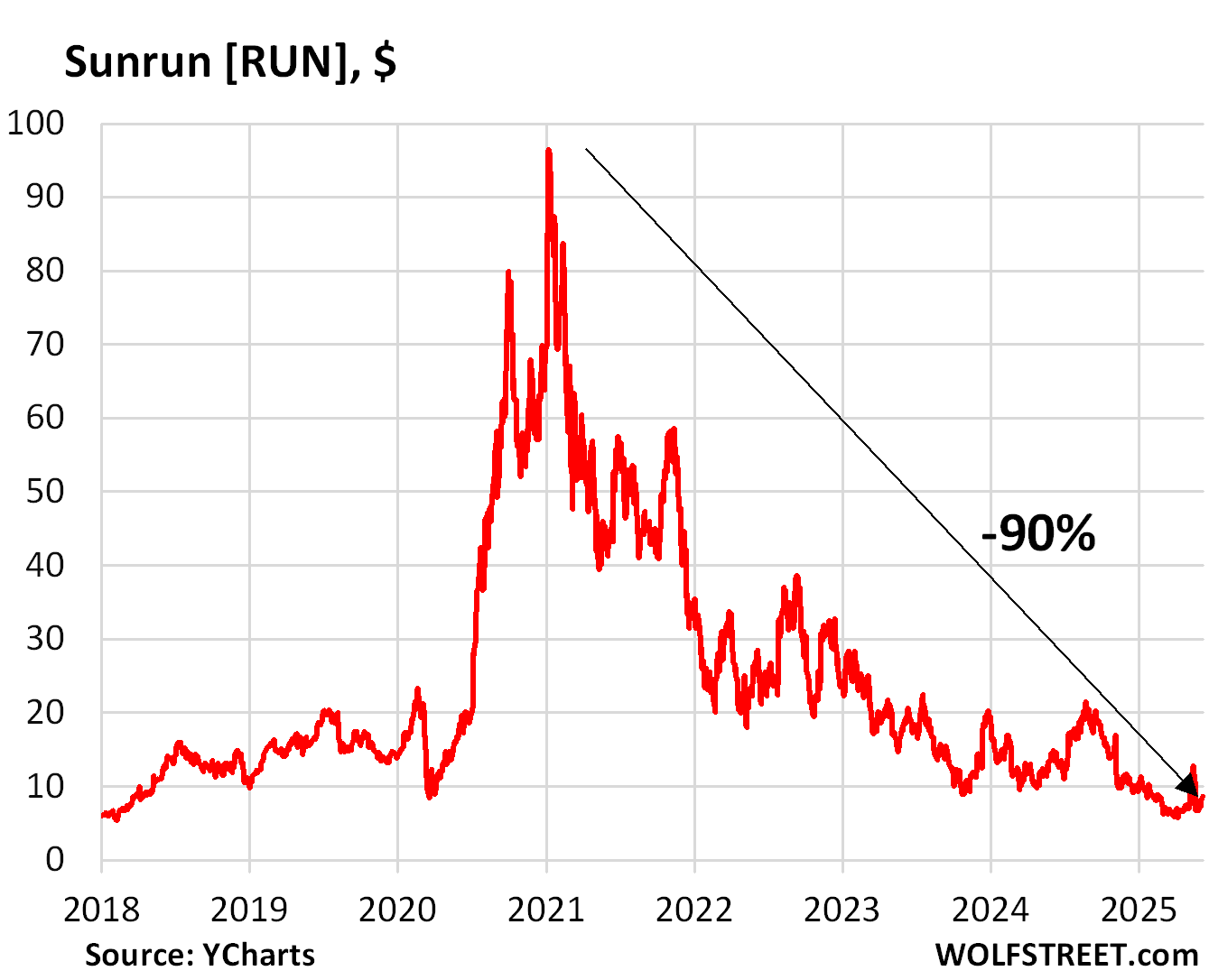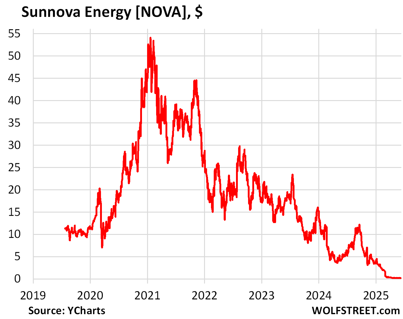 The marvel was of course its stock [NOVA] during the free-money pandemic. It went public in July 2019 at $12 a share and traded around $10 until the free money during the pandemic came along and caused the share price to spike five-fold to $55 by February 2021. That month, right at the peak, the Texas-based company acquired SunStreet from homebuilder Lennar, and Lennar washed its hands off it. Then the shares went to heck and were inducted into our pantheon of Imploded Stocks (minimum requirement: -70% from peak).
