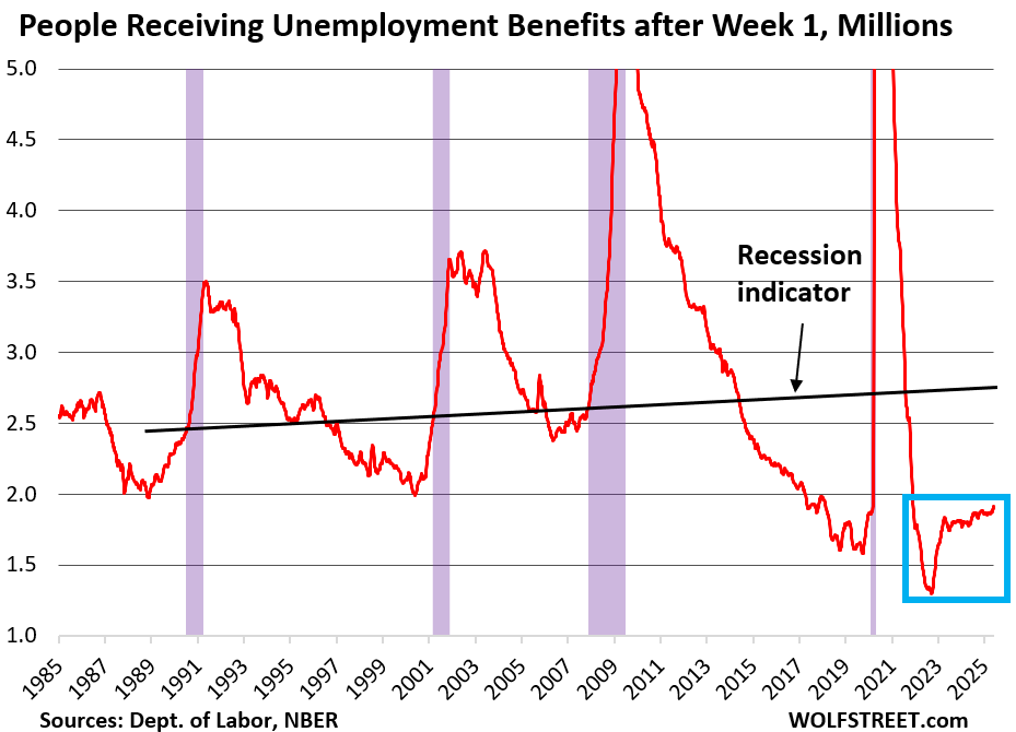 To clarify the terminology: It’s not 1.95 million “unemployed” but 1.95 million “Insured Unemployed” = only people who have filed for unemployment insurance benefits for at least a second week. This is not the total number of unemployed, which includes many people who are not eligible to file for unemployment for whatever reason. There are over 7 million “unemployed,” which produces the unemployment rate of 4.2%, which are different metrics obtained differently (via survey).