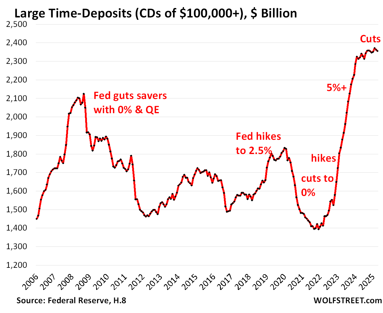 These small CDs reflect regular savers. When the Fed gutted savers’ cash flow from savings in 2008, they began spurning CDs, and by mid-2022, small CDs had nearly vanished.